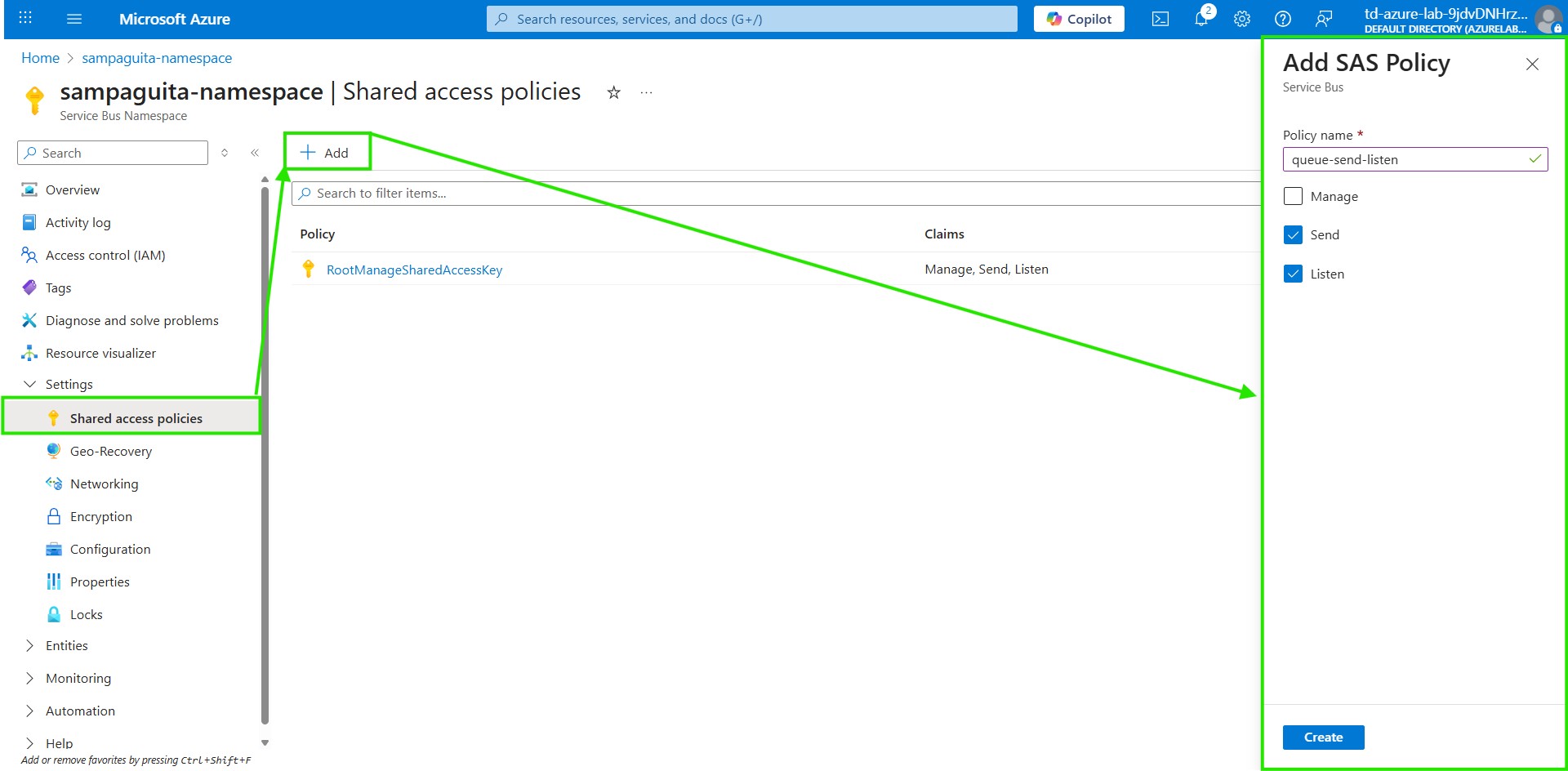 2. You can click the default RootManageSharedAccessKey to review the existing connection keys. For this lab, create a new scoped policy by clicking + Add.