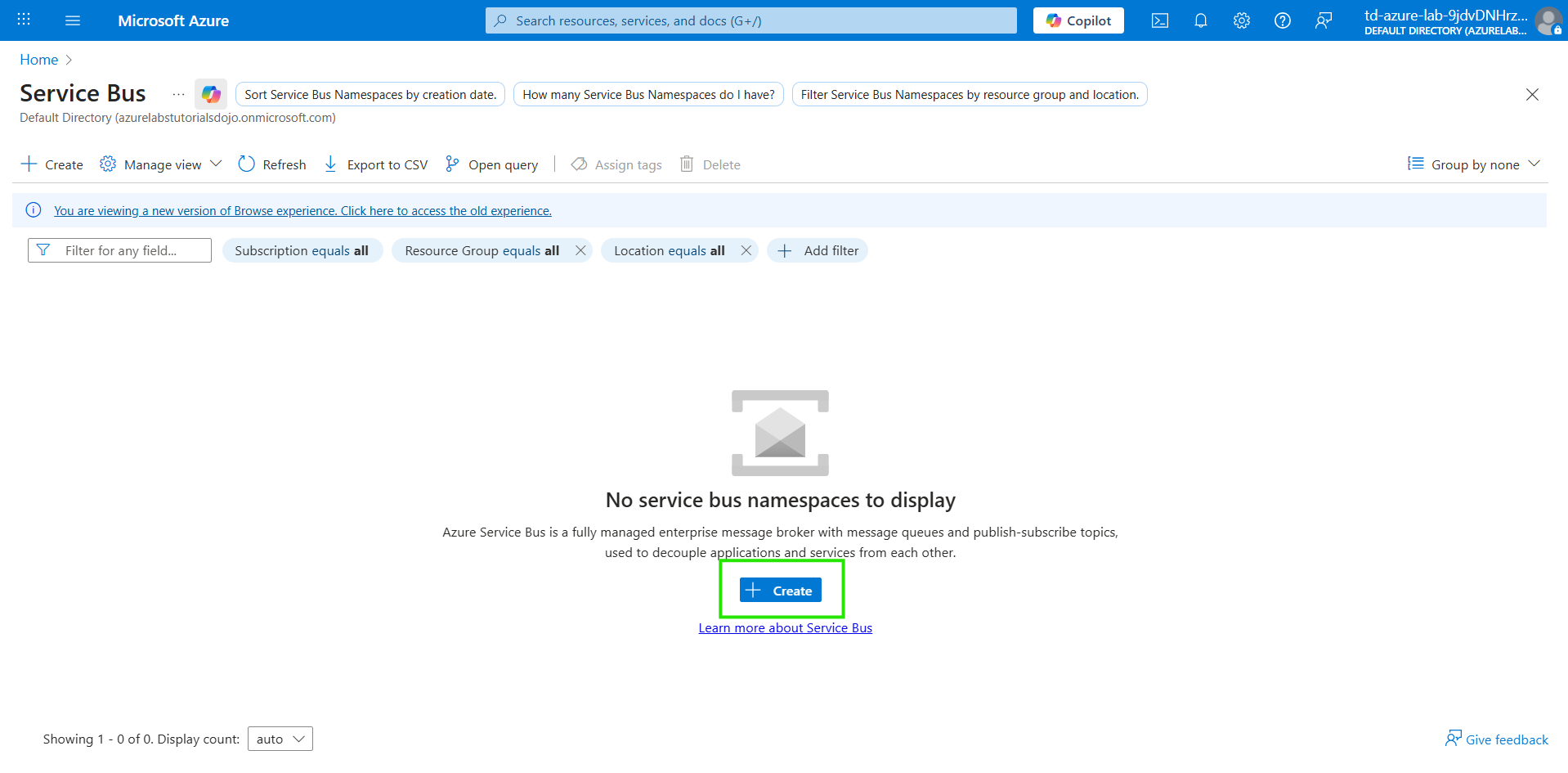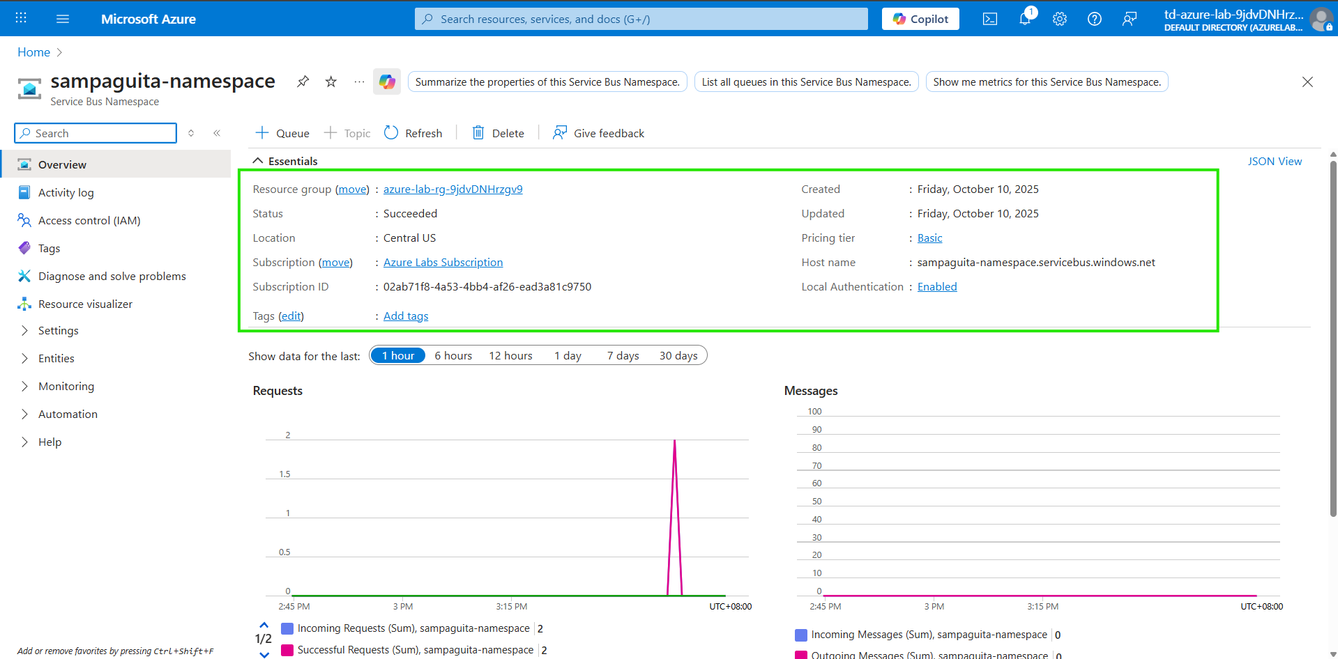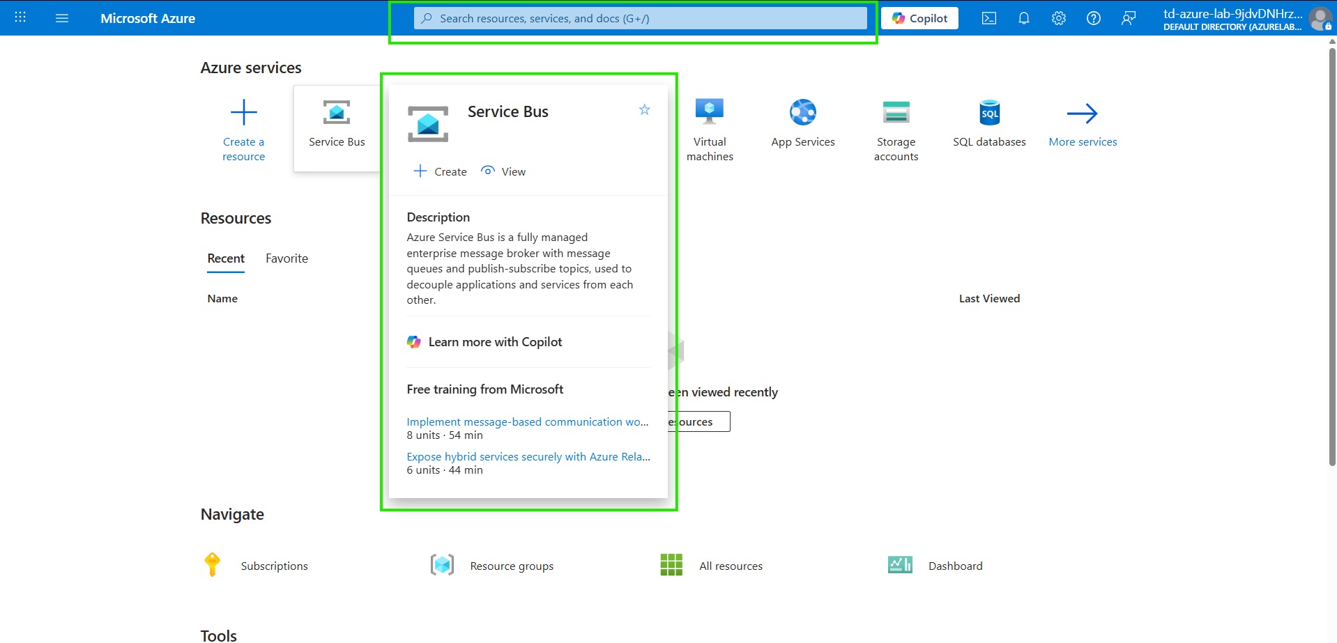 In this guided lab, a new Service Bus namespace will be created and configured under a constrained lab environment. Because this environment allows only the Basic SKU, the focus will be on creating a queue (topics and advanced features are unavailable in Basic).