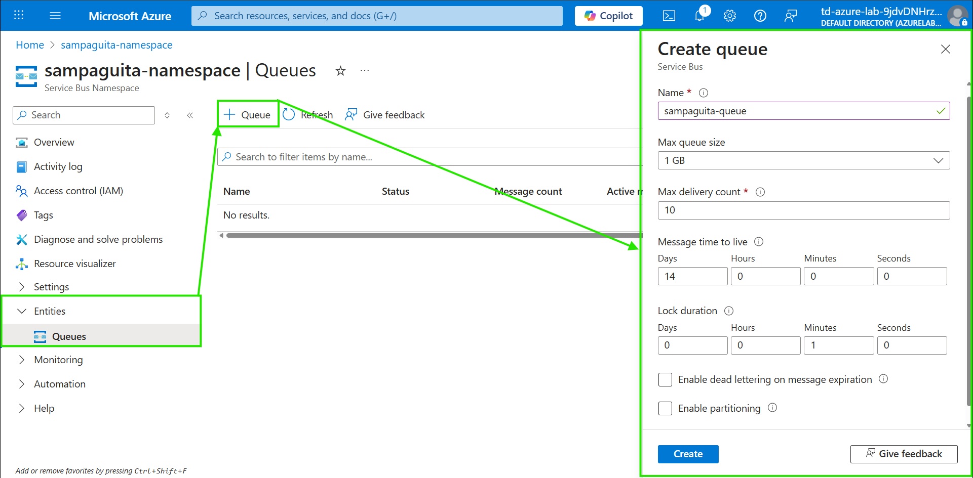 1. In the namespace blade, under Entities, select Queues, then click + Queue.