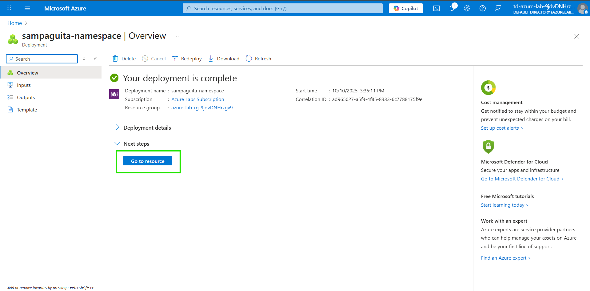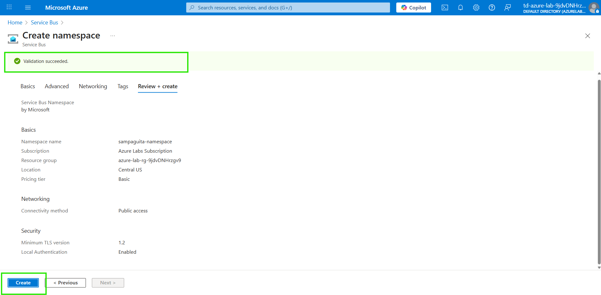 azure-lab-rg-9jdvDNHrzgv9 - Namespace name: Enter sampaguita-namespace. If the name is already taken, add numbers or characters to make it globally unique (for example, sampaguita-namespace123).