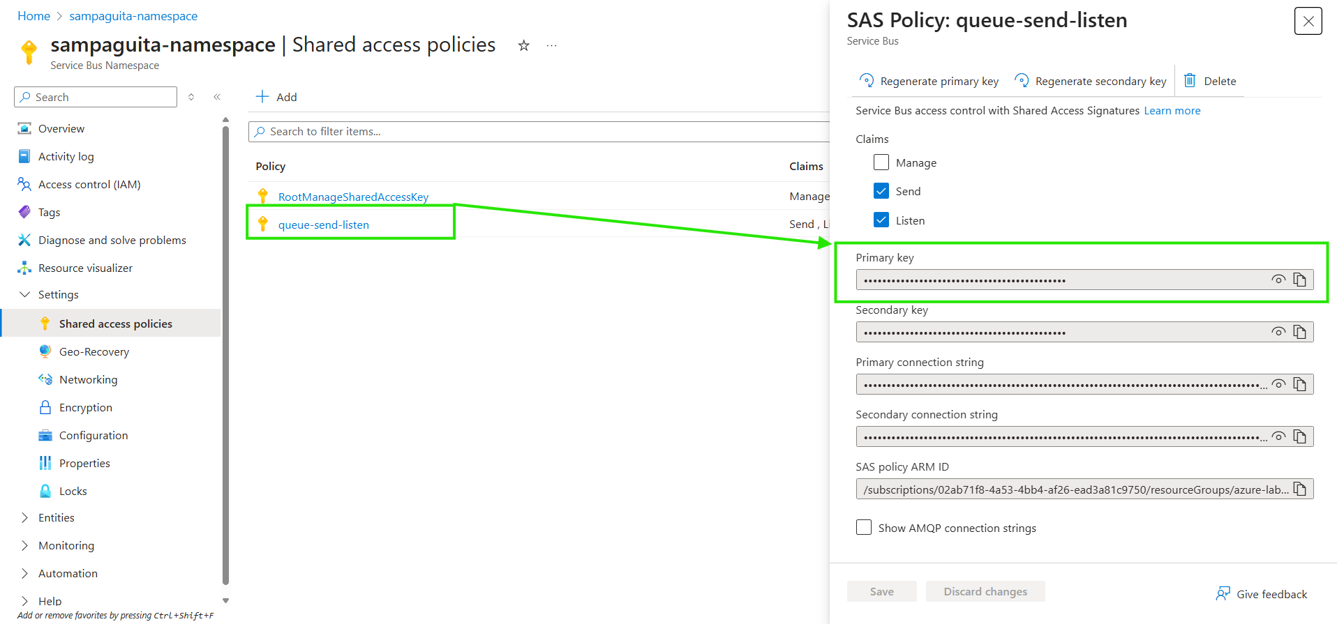 - Set up and verify shared access policies (SAS) for the namespace.