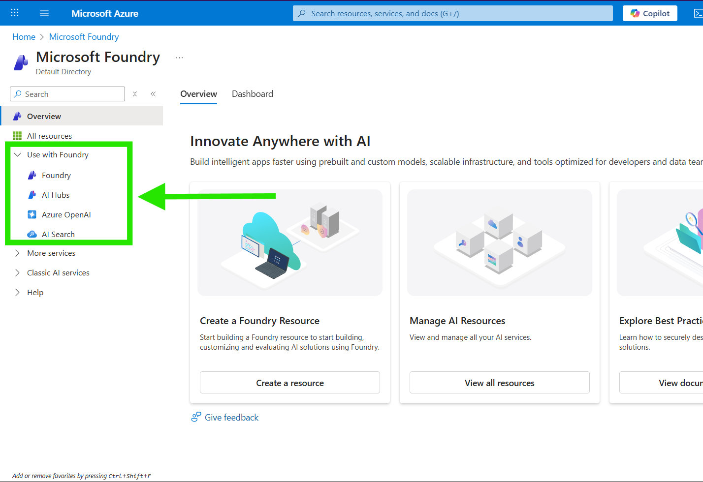 3. On the Microsoft Foundry blade, expand the “Use with Foundry” and then navigate to Foundry.