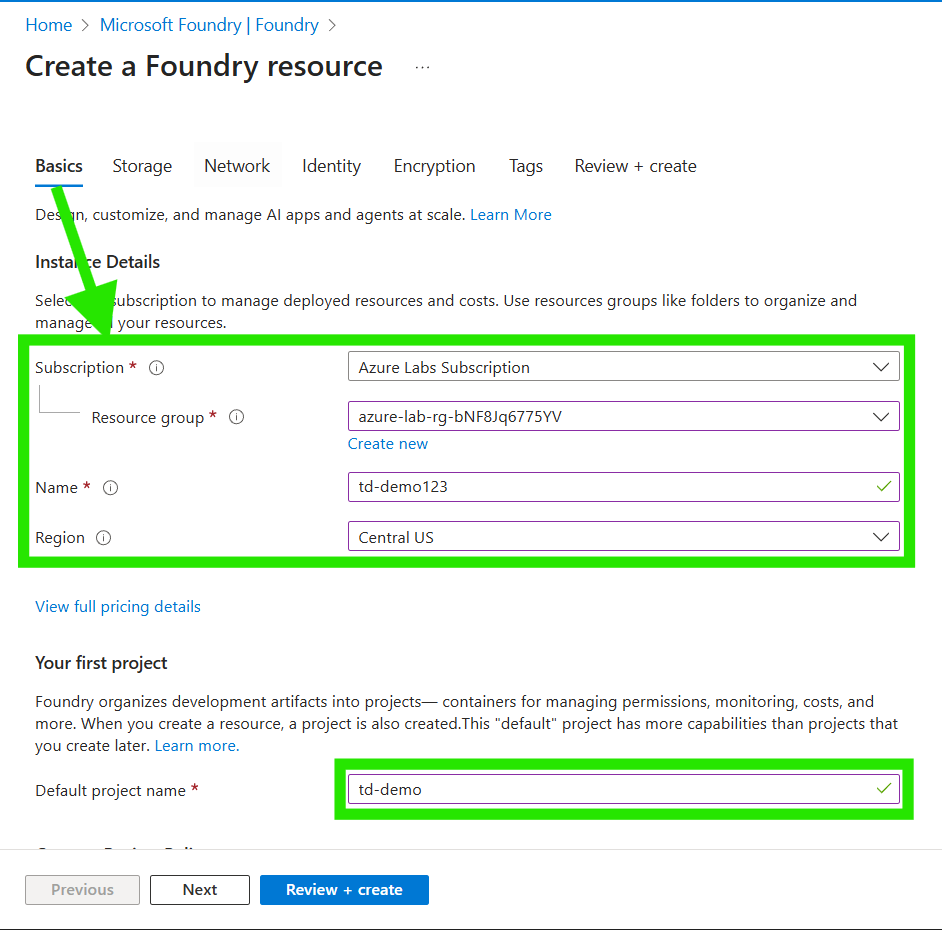 - Create a new Foundry project by configuring core settings such as resource group, workspace name, and region.