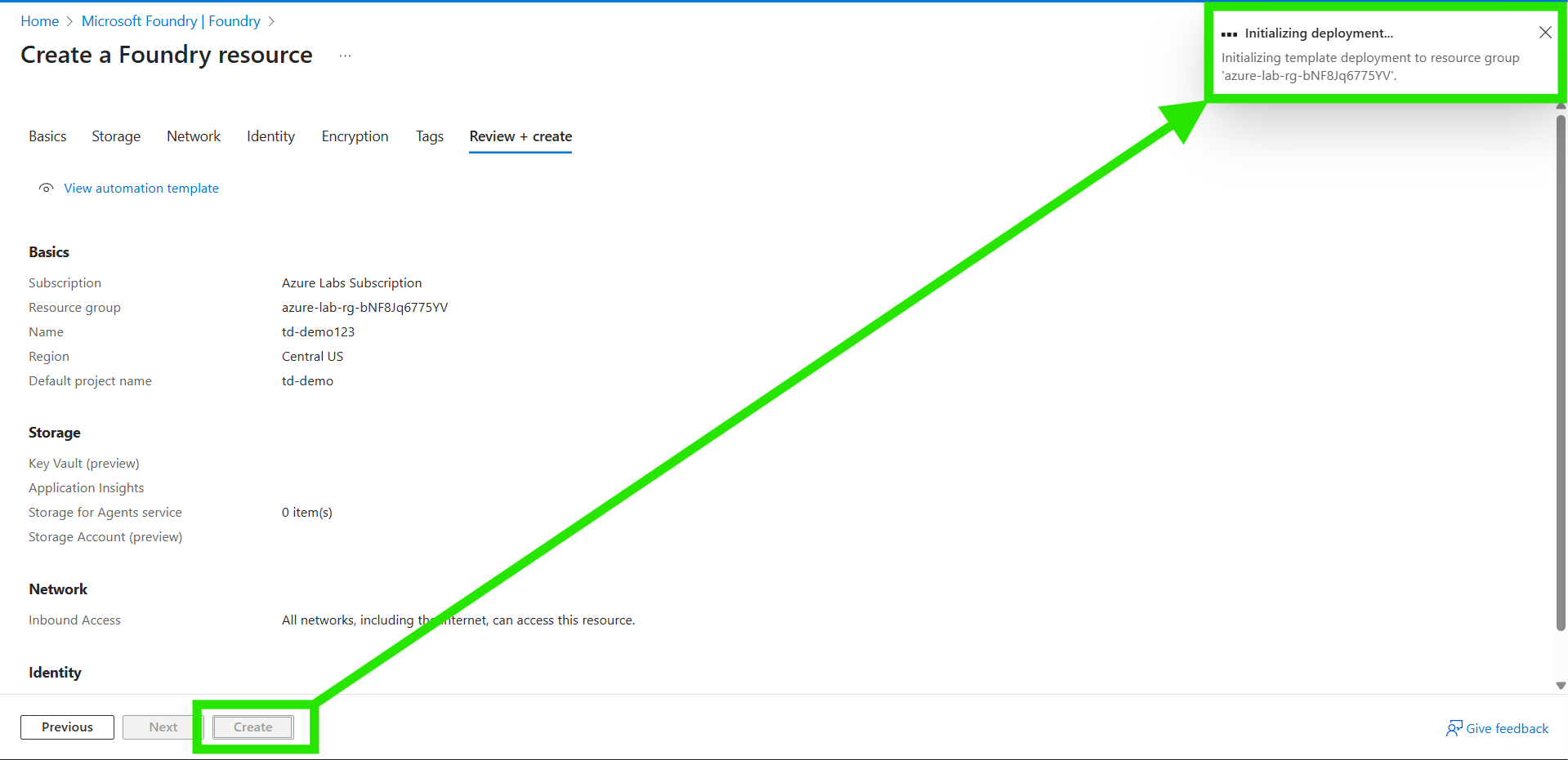 - Deploy the Foundry workspace and monitor progress in the Deployment Overview blade.
