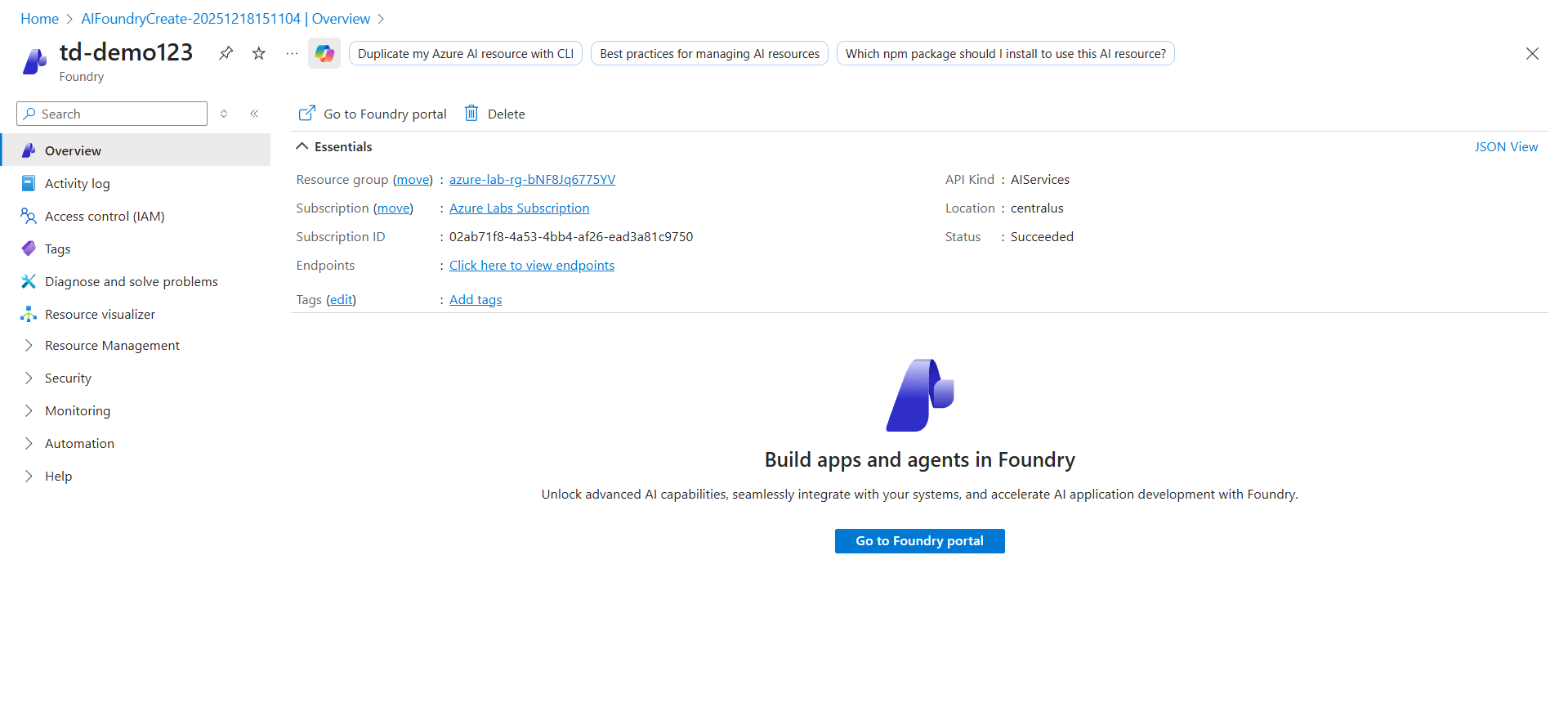 Congratulations! You’ve successfully deployed Microsoft Foundry using the Azure portal. In this guided lab, you navigated to Foundry, created a new project, configured core settings, monitored deployment progress, and accessed the Foundry portal.