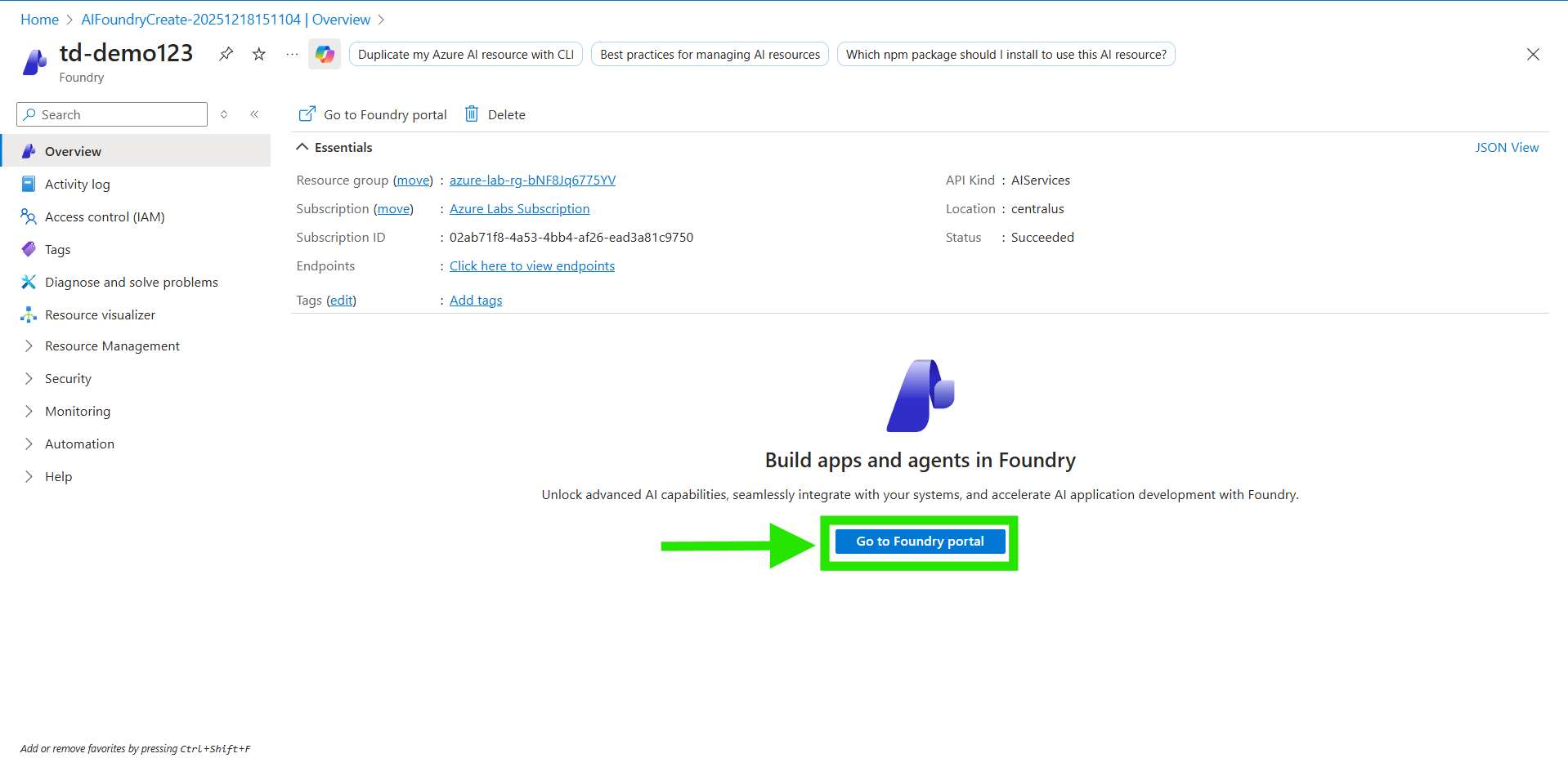 This lab guides you through deploying a Microsoft Foundry workspace in the Azure portal, highlighting essential configuration steps and showing you how to access the Foundry portal for project creation and management.