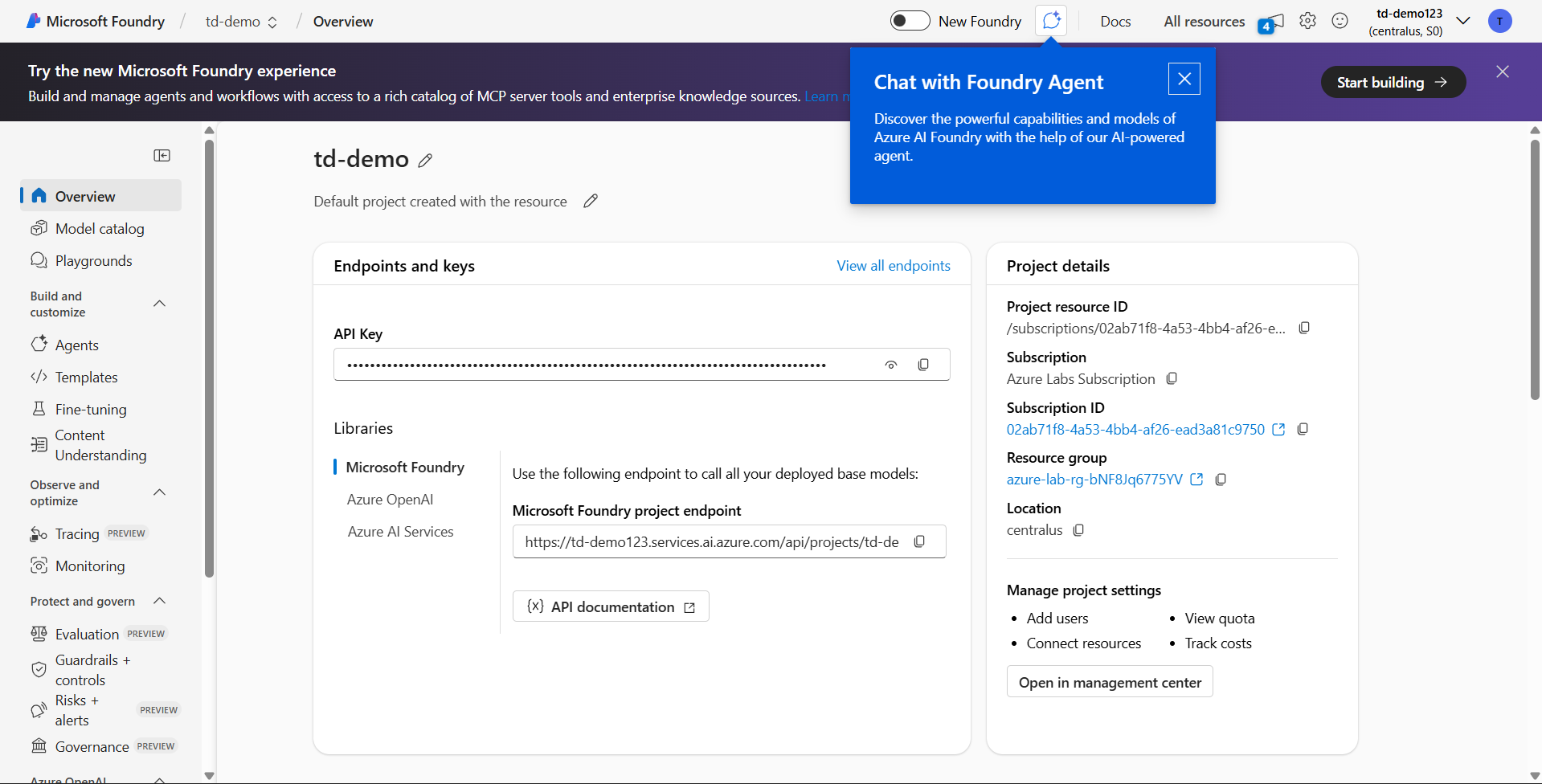 You’ll be redirected to the Foundry portal, where you can begin building, deploying, and managing your applications and services.