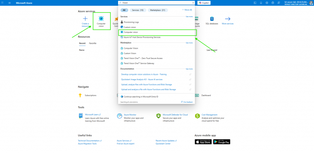 1. Navigate to Azure AI Vision or Computer Vision by typing it in the Azure portal search bar or selecting it from the homepage.
