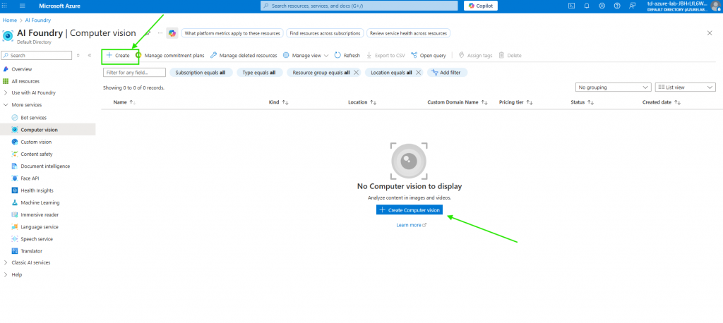 2. Start creating a new resource by clicking Create → Azure AI Vision at the top menu bar or the Create button at the center of the service page.