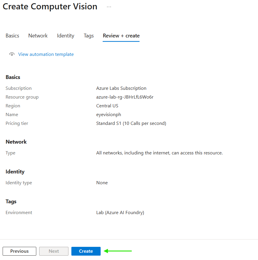 In this guided lab, you’ll learn how to create an Azure AI Vision resource in the Azure portal. You’ll configure essential settings, review deployment progress, and verify that the resource is successfully provisioned for future integration with image and video analysis applications.