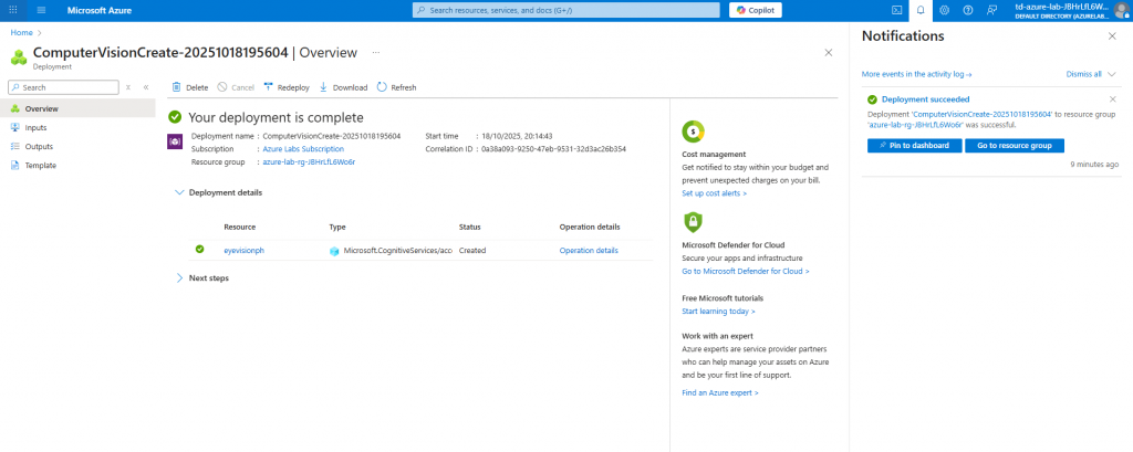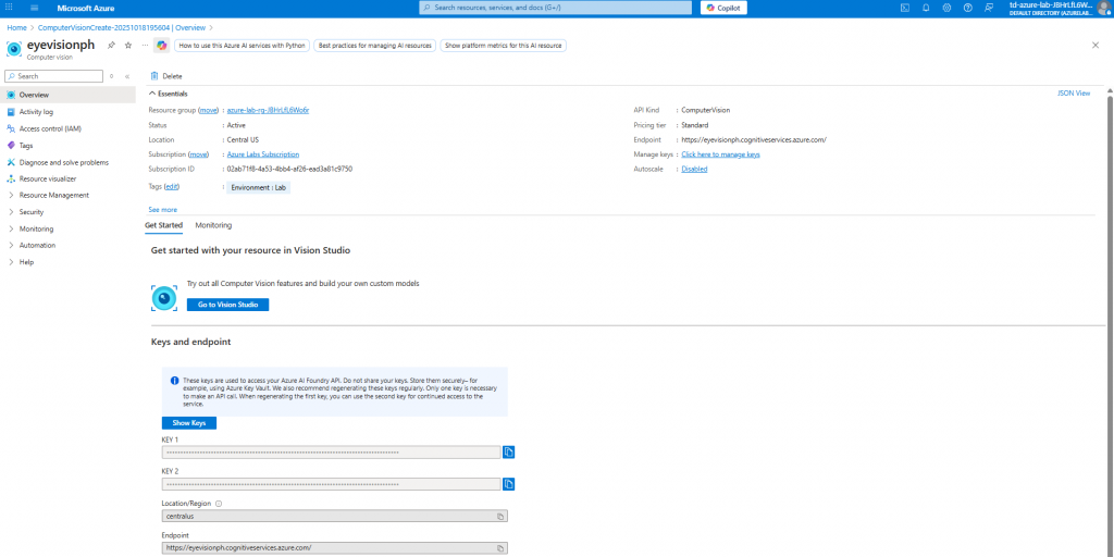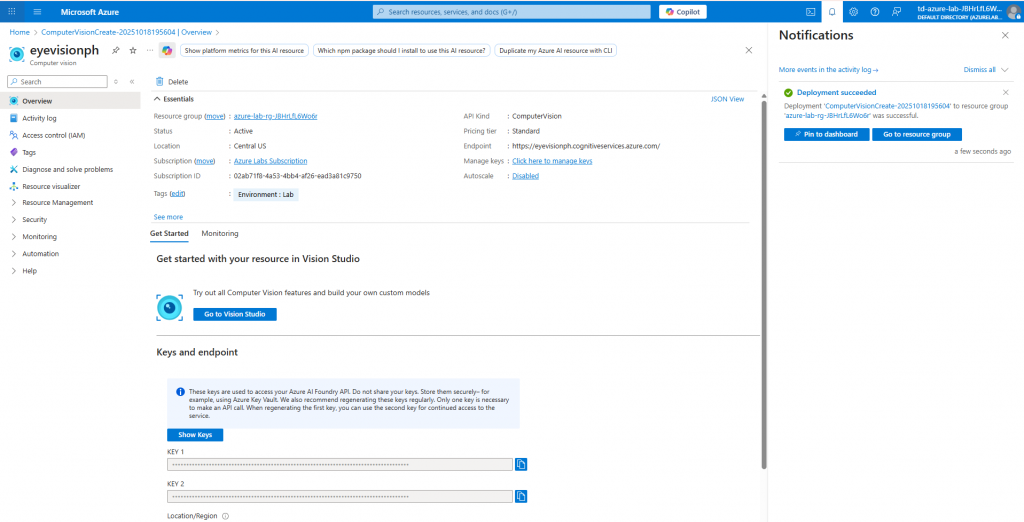 That’s it! Using the Azure portal, you’ve successfully created and deployed an Azure AI Vision resource. In this lab, you practiced navigating Azure services, configuring core resource settings, monitoring deployment progress, and validating access credentials. Your Azure AI Vision resource is ready to power intelligent applications that recognize images, analyze visual content, and deliver real-time insights.