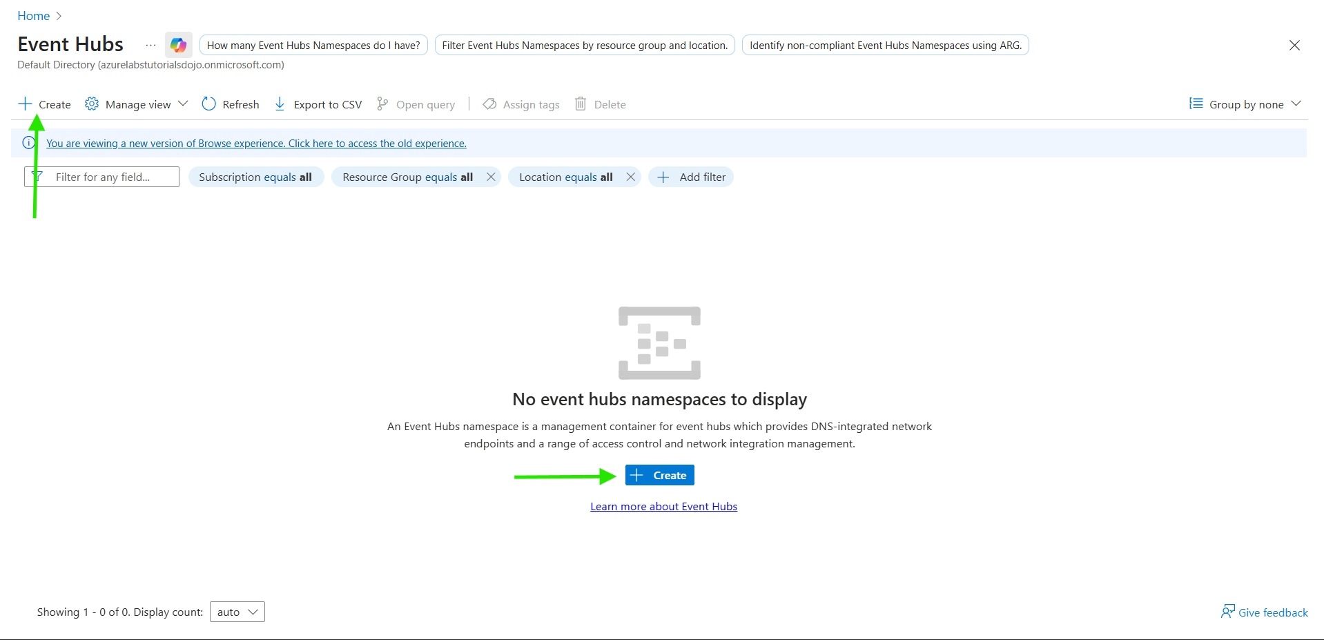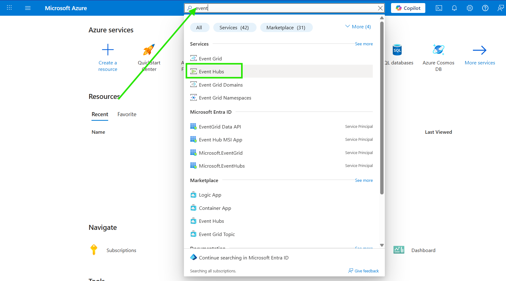 - Navigate to and launch the Event Hubs service in the Azure portal.