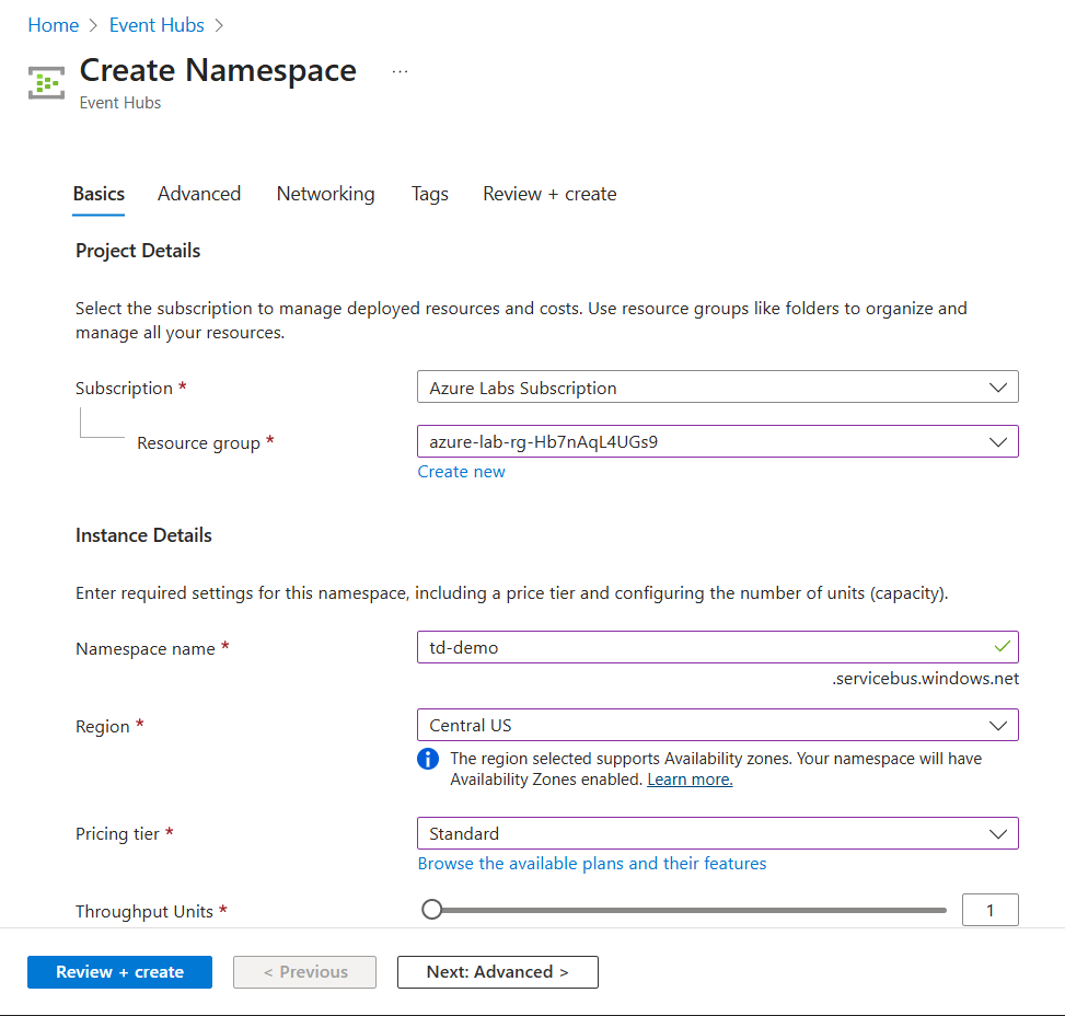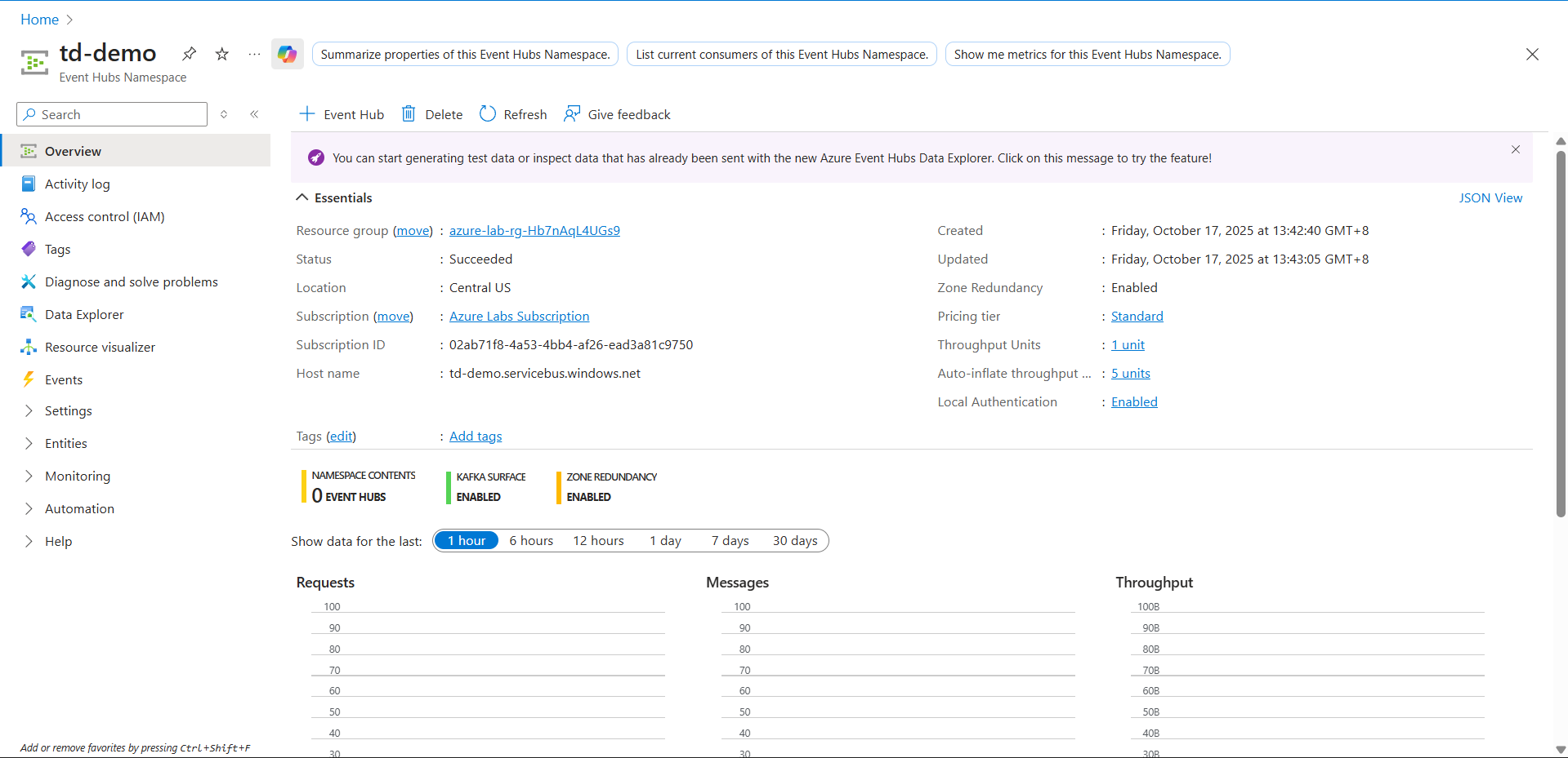 In this guided lab, you’ll walk through the process of provisioning an Event Hubs namespace using the Azure portal. You’ll learn how to configure essential settings, explore optional performance features, and monitor deployment status.