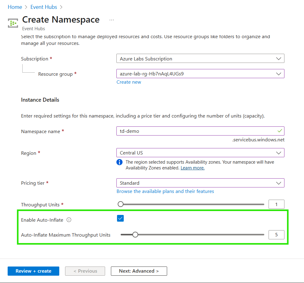 - You may also enable Auto-Inflate to dynamically scale throughput.