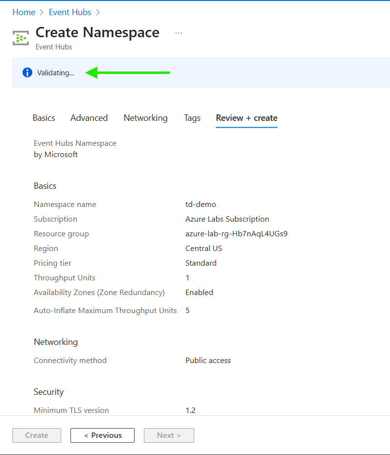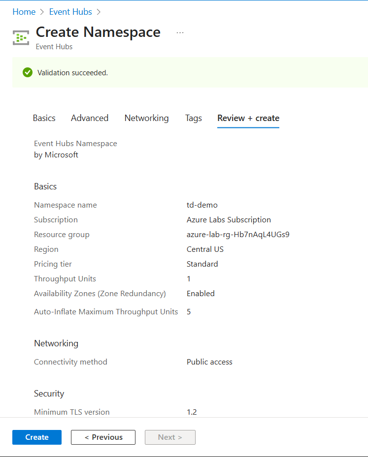 5. Once validated, review all configurations and click Create to initiate the deployment of your Azure Event Hubs Namespace.