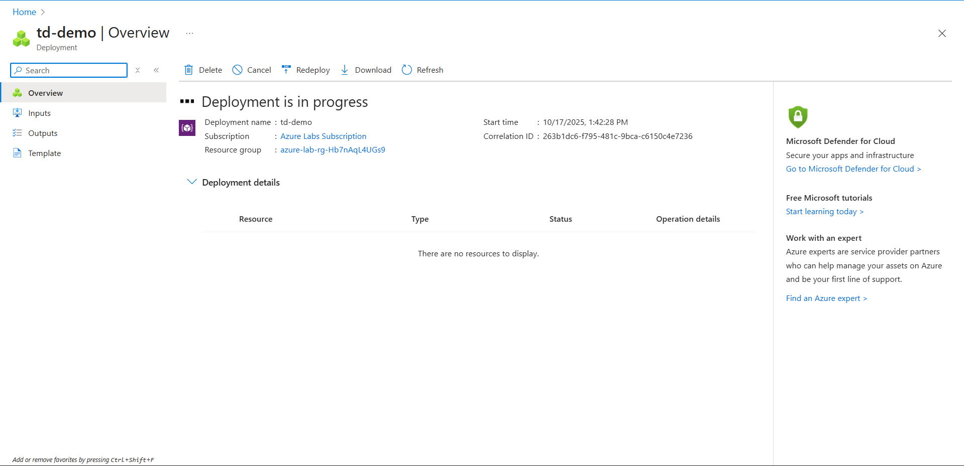 - Resource Details: Lists each deployed resource, its type, and operation status.