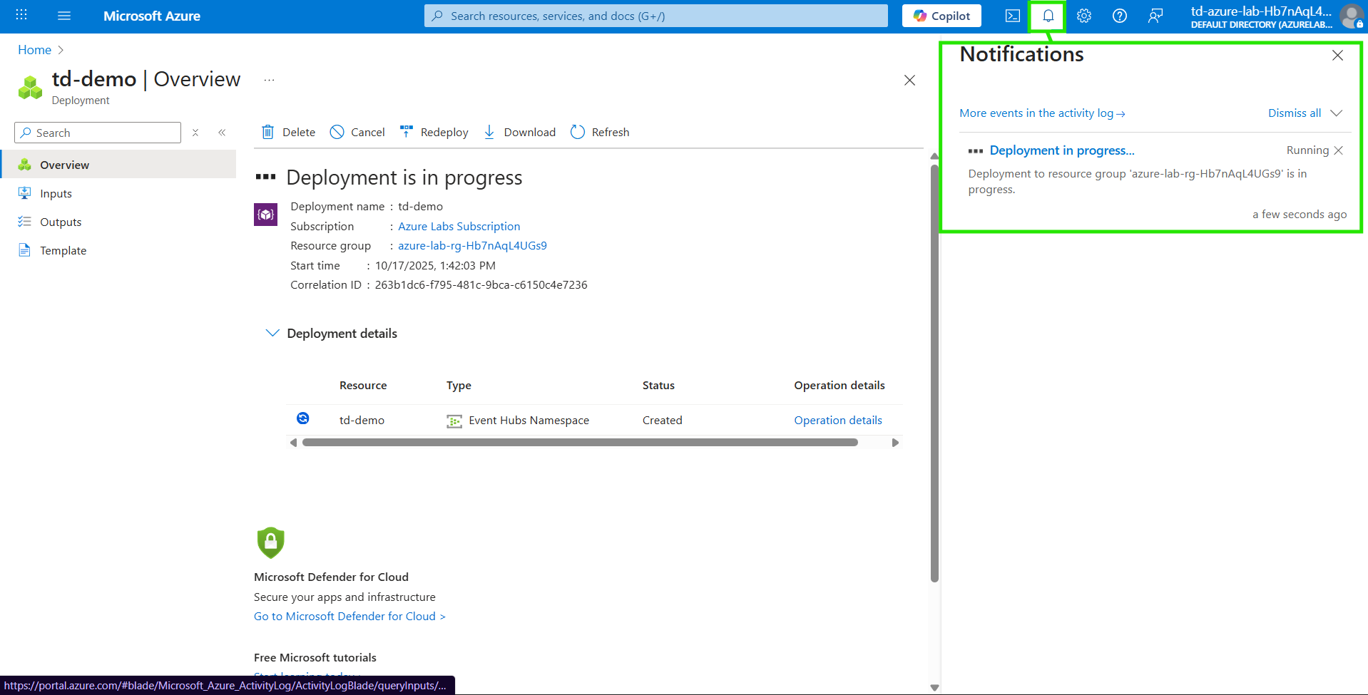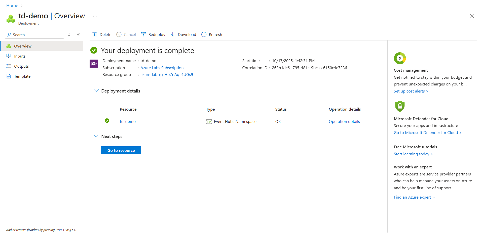 Once you’ve clicked Create, Azure begins provisioning your Event Hubs Namespace. You’ll be redirected to the Deployment Overview blade, where you can monitor the progress in real time.