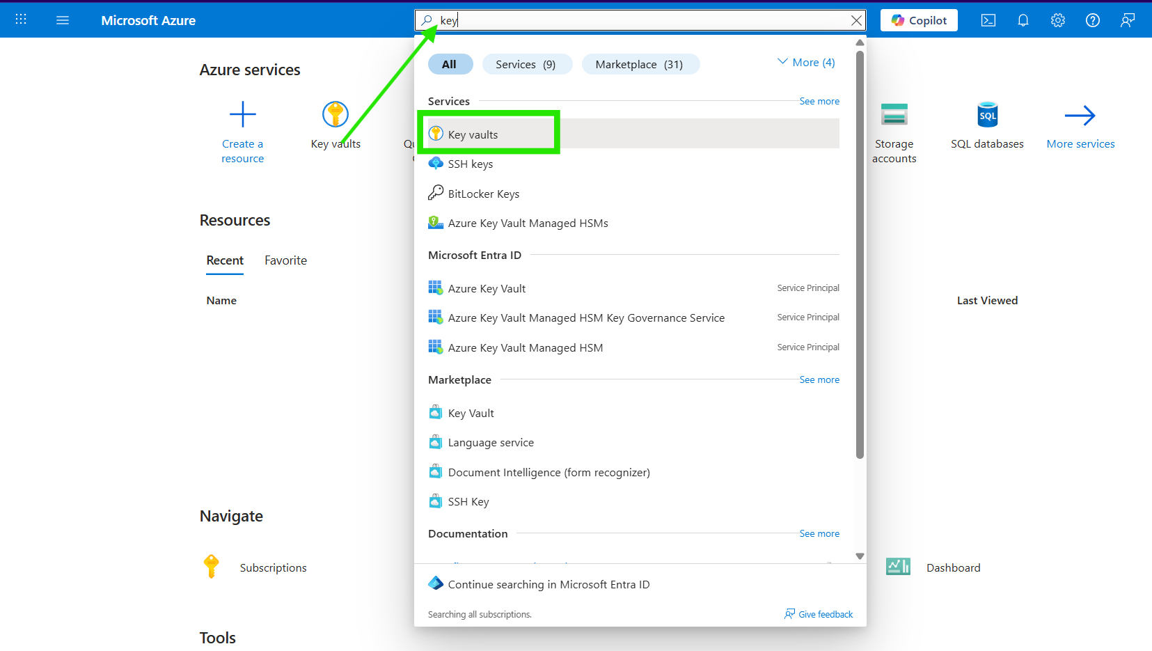 - Navigate the Azure portal to access the Key Vault creation interface.