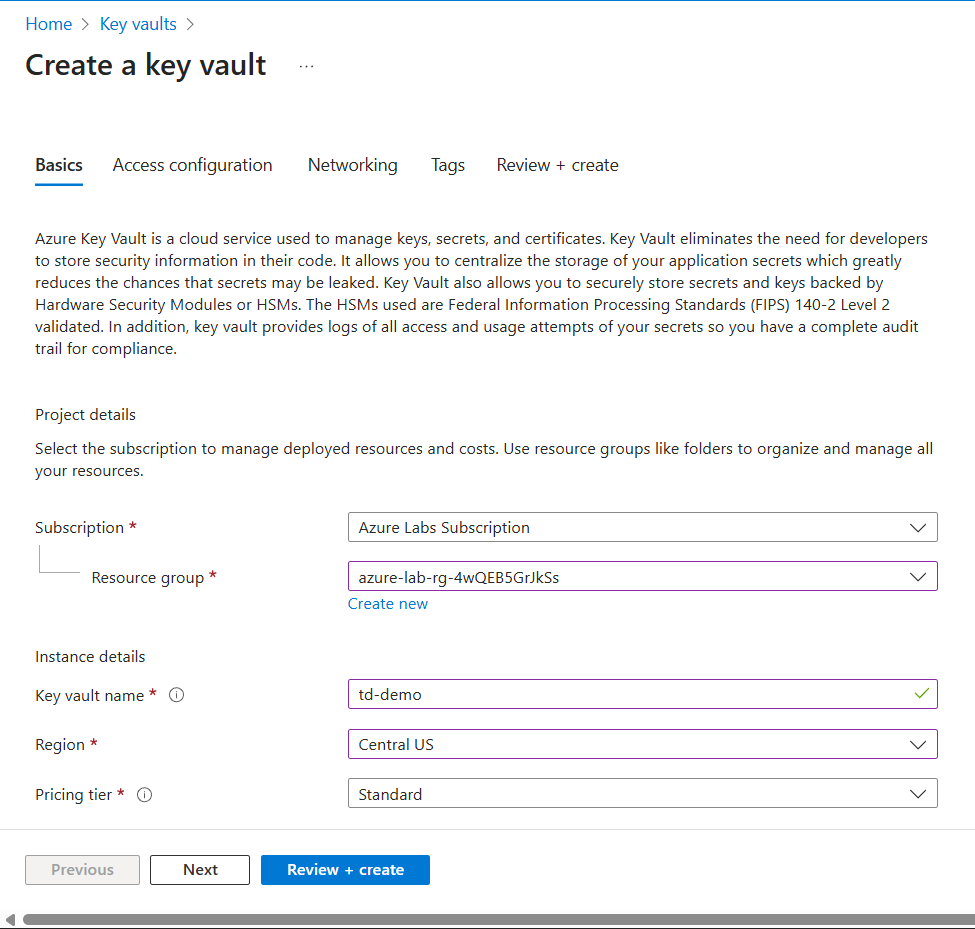 This lab walks you through the step-by-step process of provisioning an Azure Key Vault using the portal interface. You’ll focus on essential configuration tasks including selecting a resource group, naming the vault, choosing a region and pricing tier, and reviewing deployment details. By the end of this exercise, you’ll have a securely deployed Key Vault ready for use.