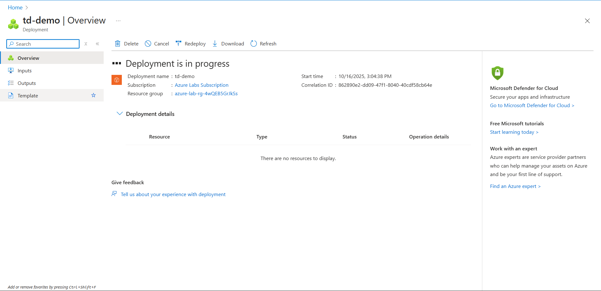 - Status – Indicates the current state of the deployment (e.g., In progress, Succeeded, Failed). Watch for errors or warnings here.