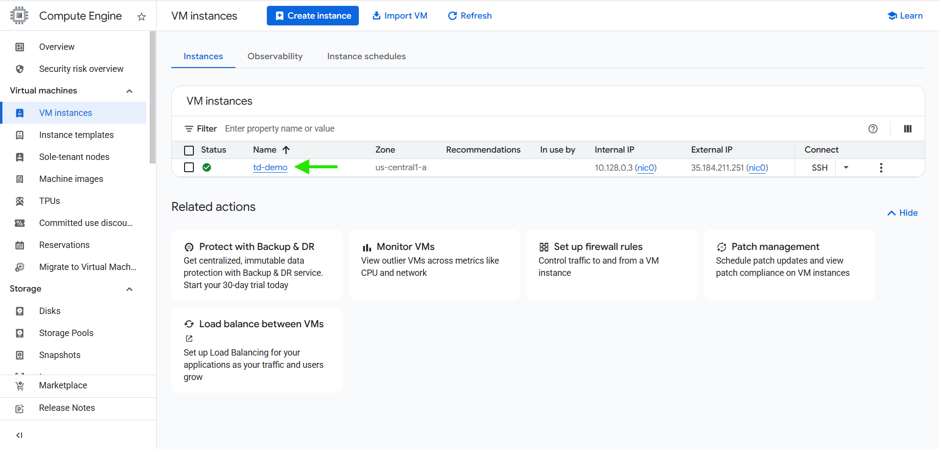 1. Once the VM is running, click on the instance name.