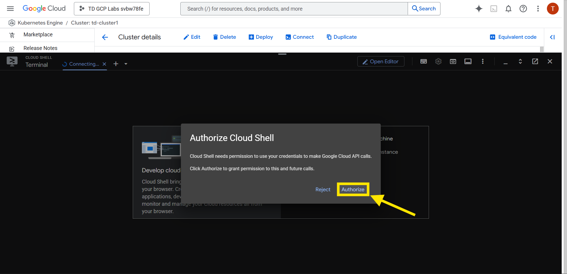 3. You will be prompted to authorize Cloud Shell. Click Authorize, then enter the username and password of the account you are currently using.