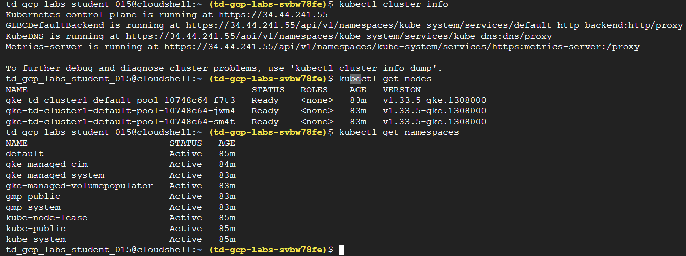 That’s it! You’ve successfully connected to your Google Kubernetes Engine cluster and verified access to its nodes and resources. This guided lab helps you become familiar with establishing secure access to a GKE cluster and reviewing its configuration. In future guided labs, we’ll build on this by deploying containerized applications, managing workloads, and exploring scaling and networking features in GKE.
