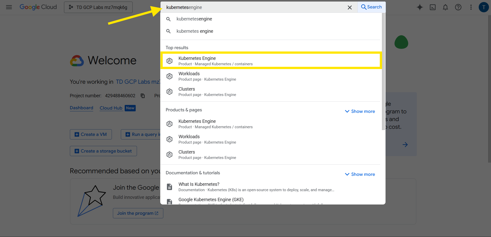 2. Type “Kubernetes” and select Kubernetes Engine from the results.
