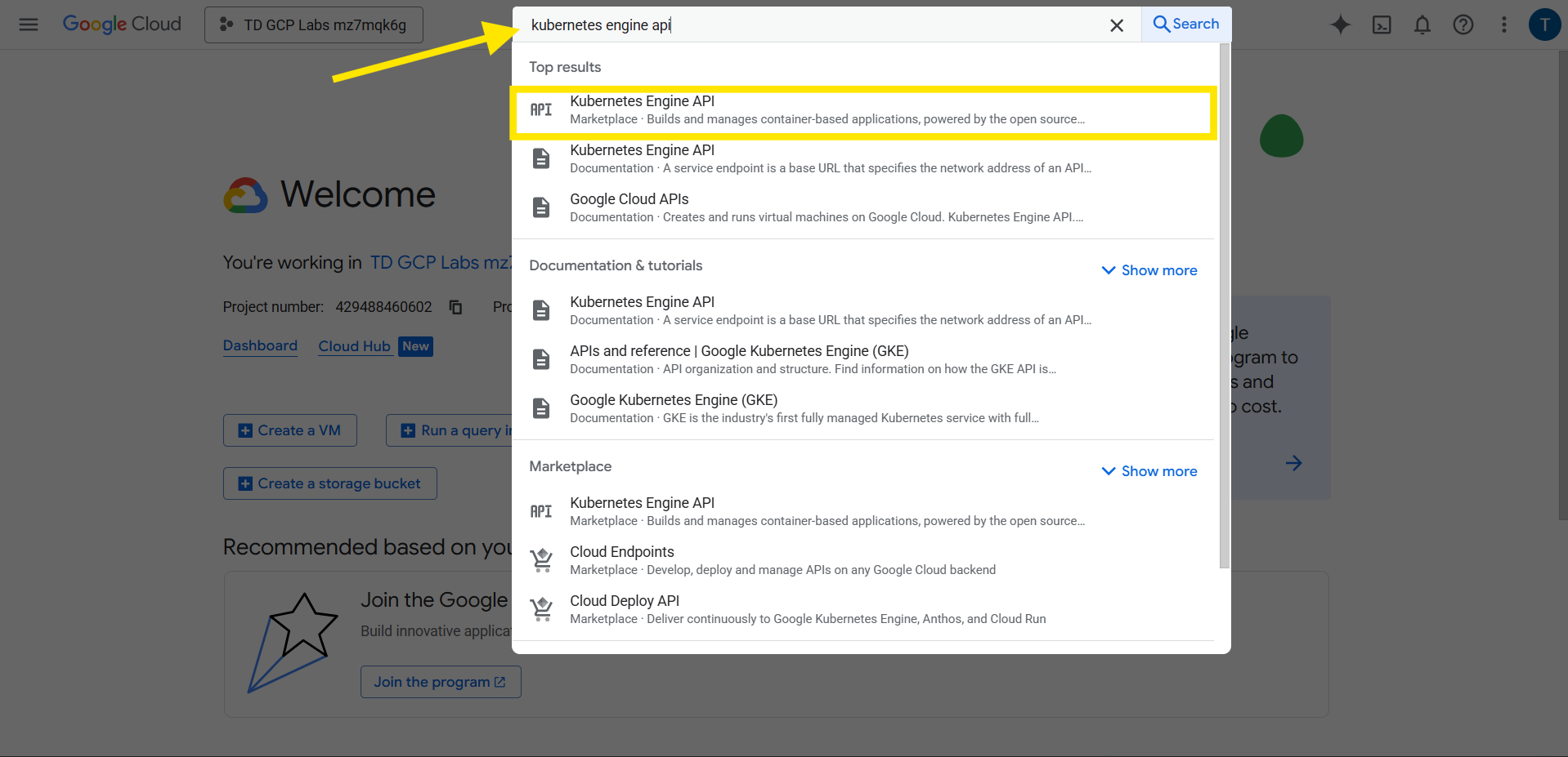 2. Type “Kubernetes Engine API” and select Kubernetes Engine API from the results.