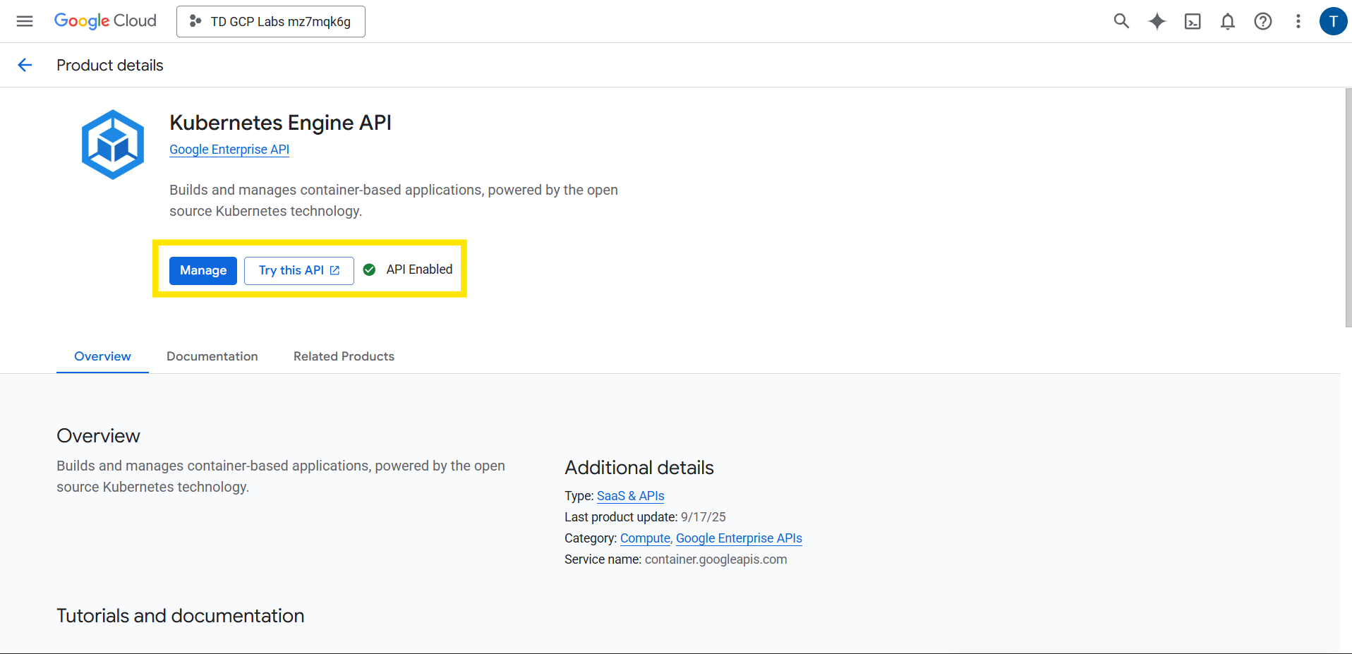 - Enable the Google Kubernetes Engine API (if still not enabled)
