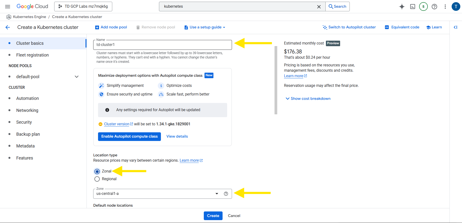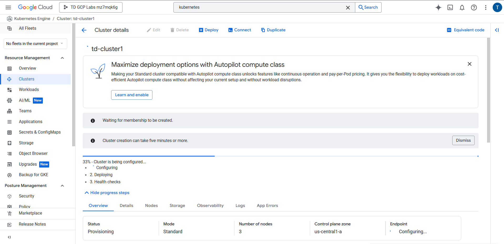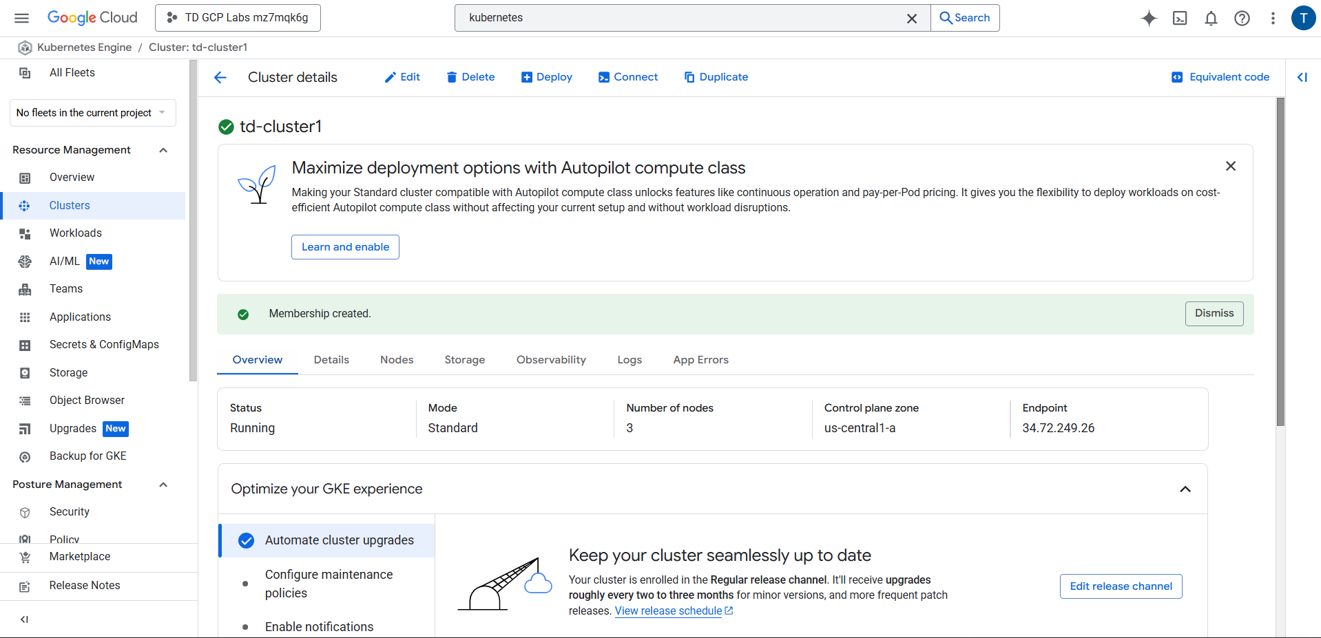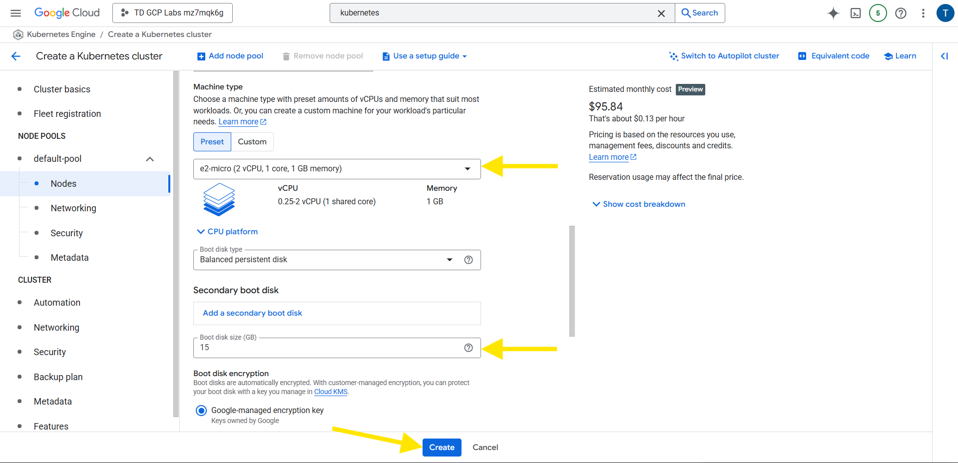- You can review the cluster’s configuration to ensure it matches your selected settings, such as cluster name, zone, node pool size, and machine type.