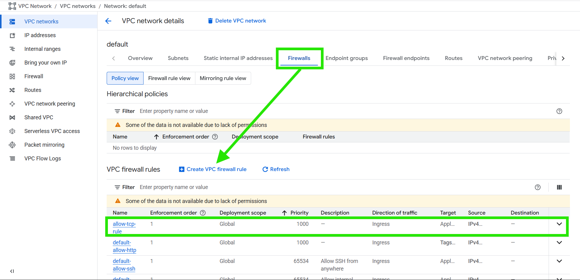 2. Navigate to Firewalls → Create VPC firewall rule → Configure: