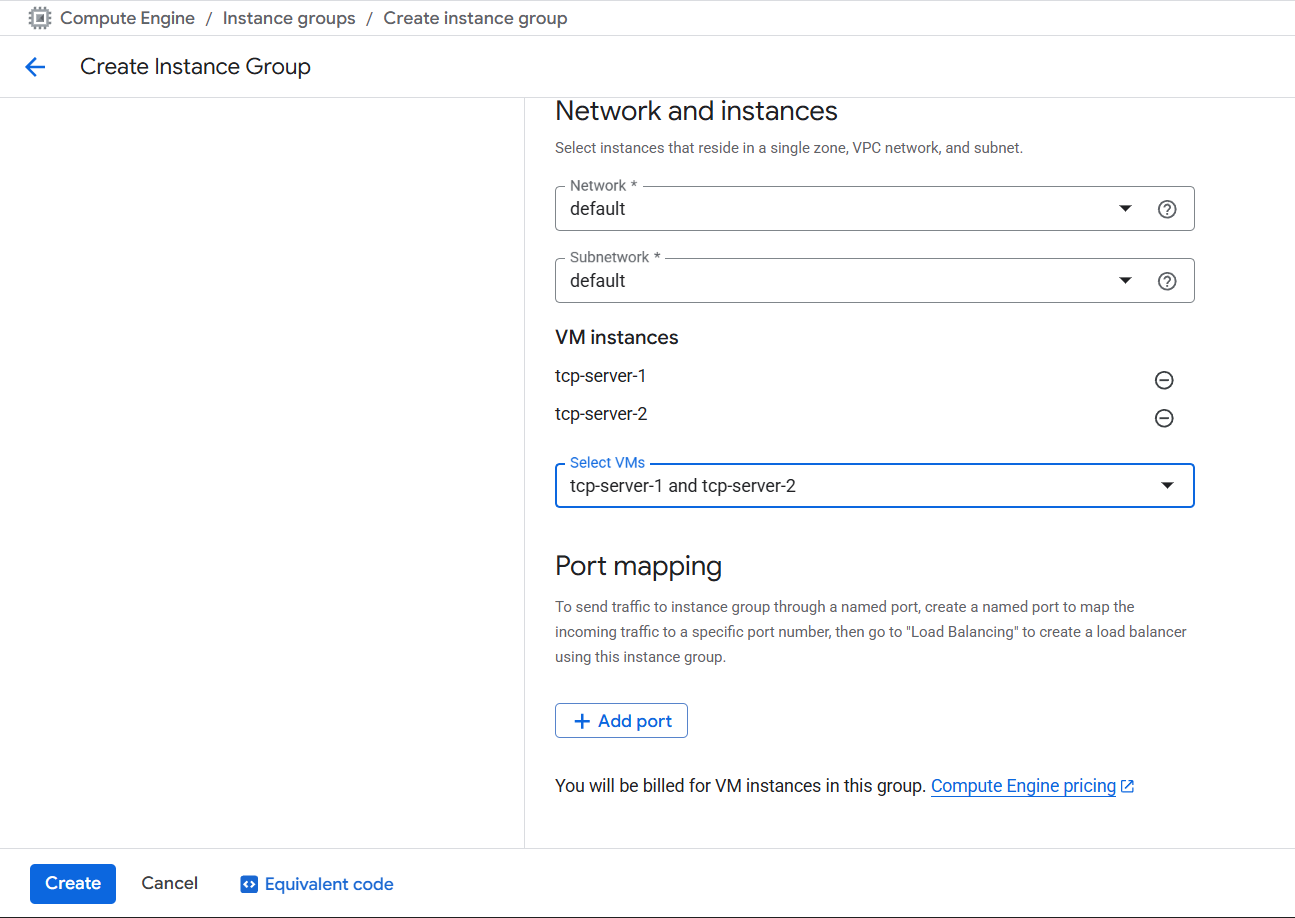 5. Add both VM instances (tcp-server-1 and tcp-server-2) to the group.