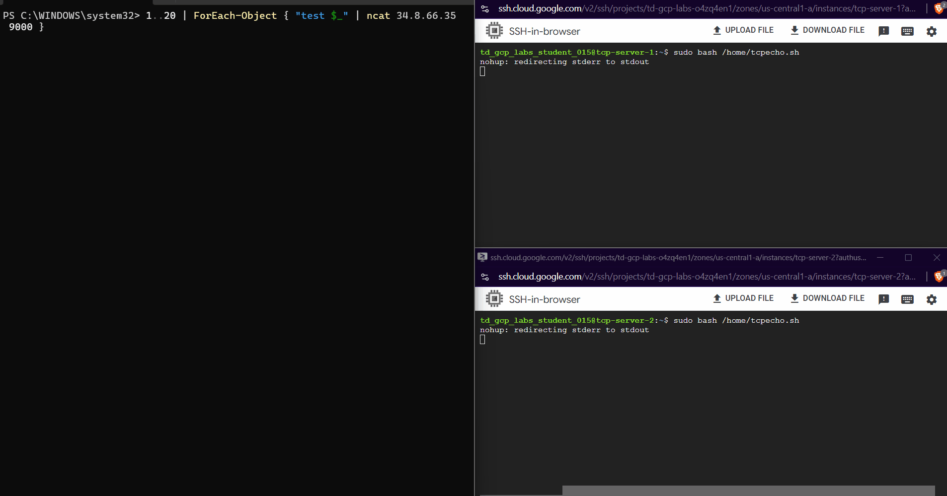 1..20 | ForEach-Object { "test $_" | ncat <LOAD_BALANCER_IP> 9000 }