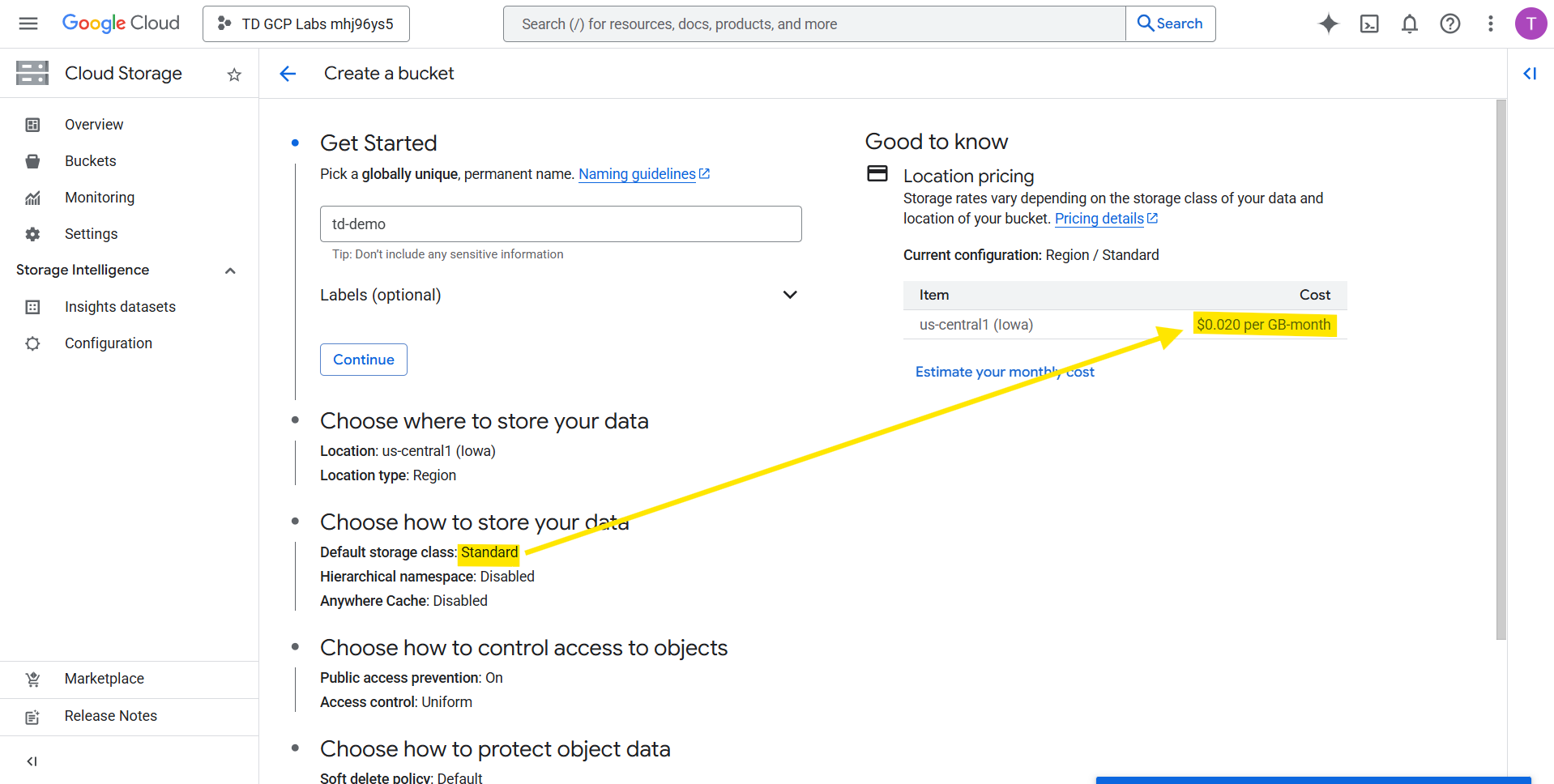 2. Select each of the storage classes one by one, then check the estimated cost of each storage class on the upper right side of the page. (Don’t proceed with creating the bucket itself)