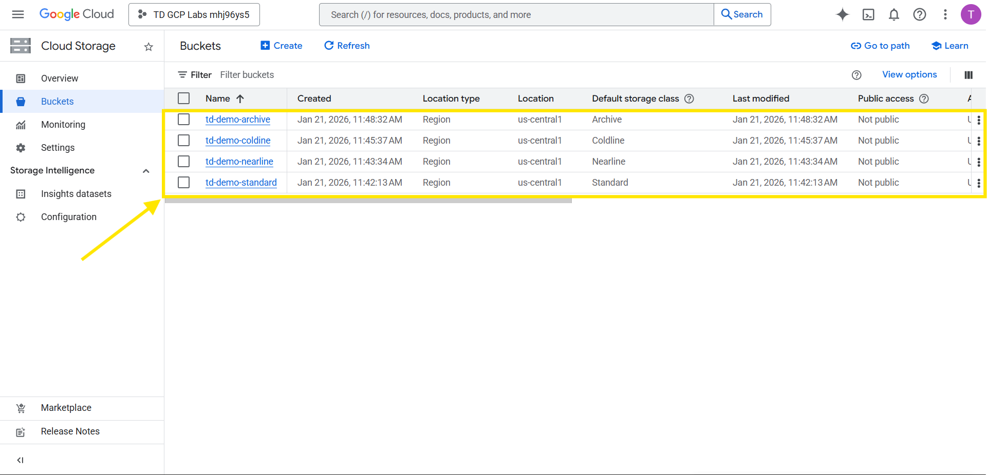 5. Confirm that the four buckets with different storage classes were created and appear in your list of buckets.