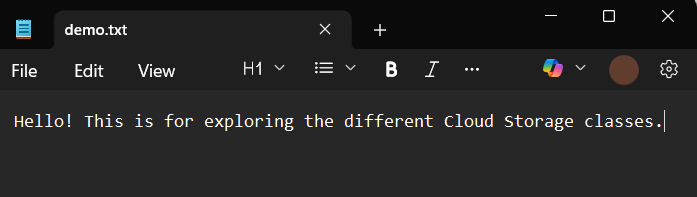 1. Create the following demo.txt file on your local machine containing “Hello! This is for exploring the different Cloud Storage classes.“: