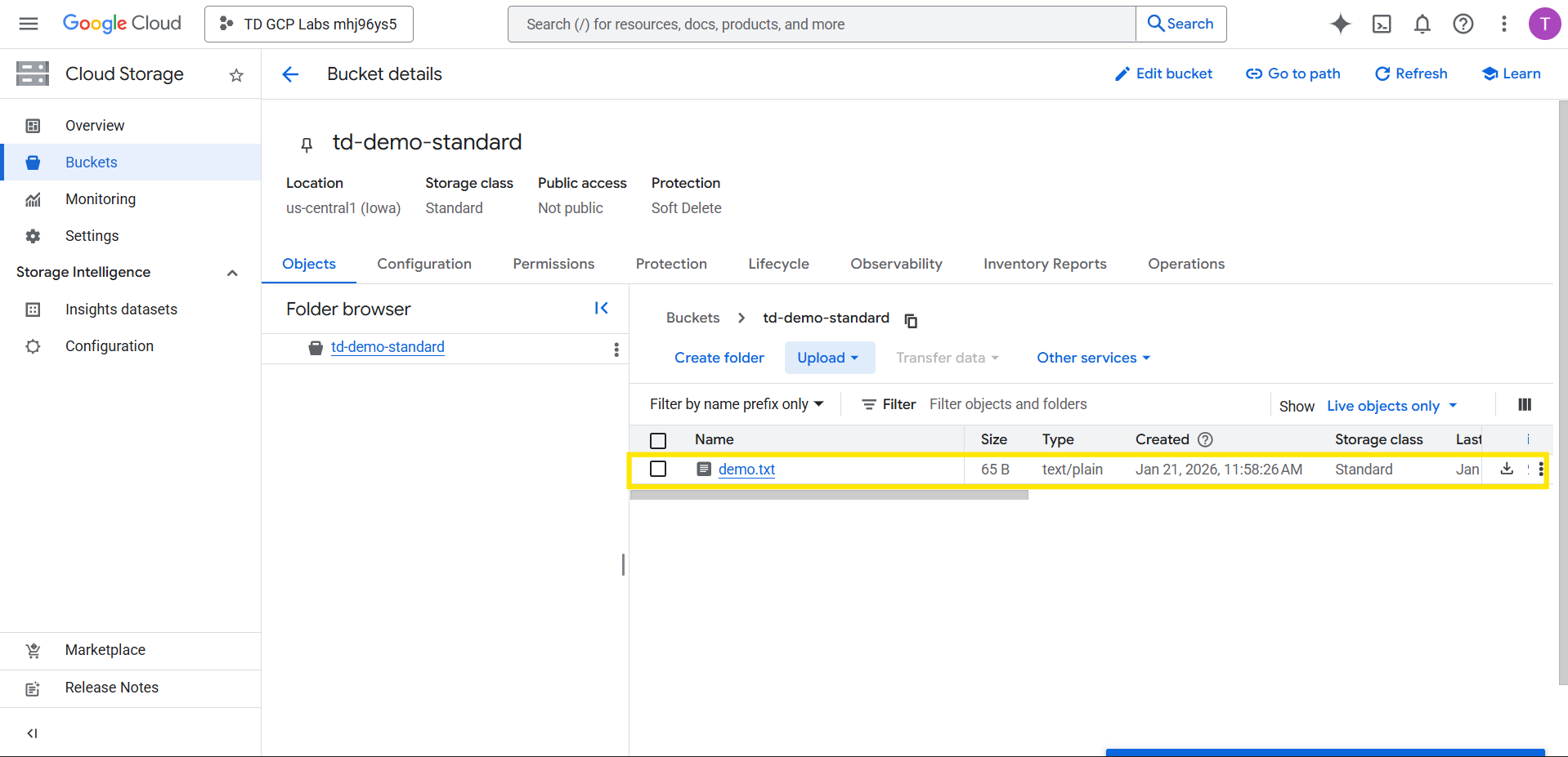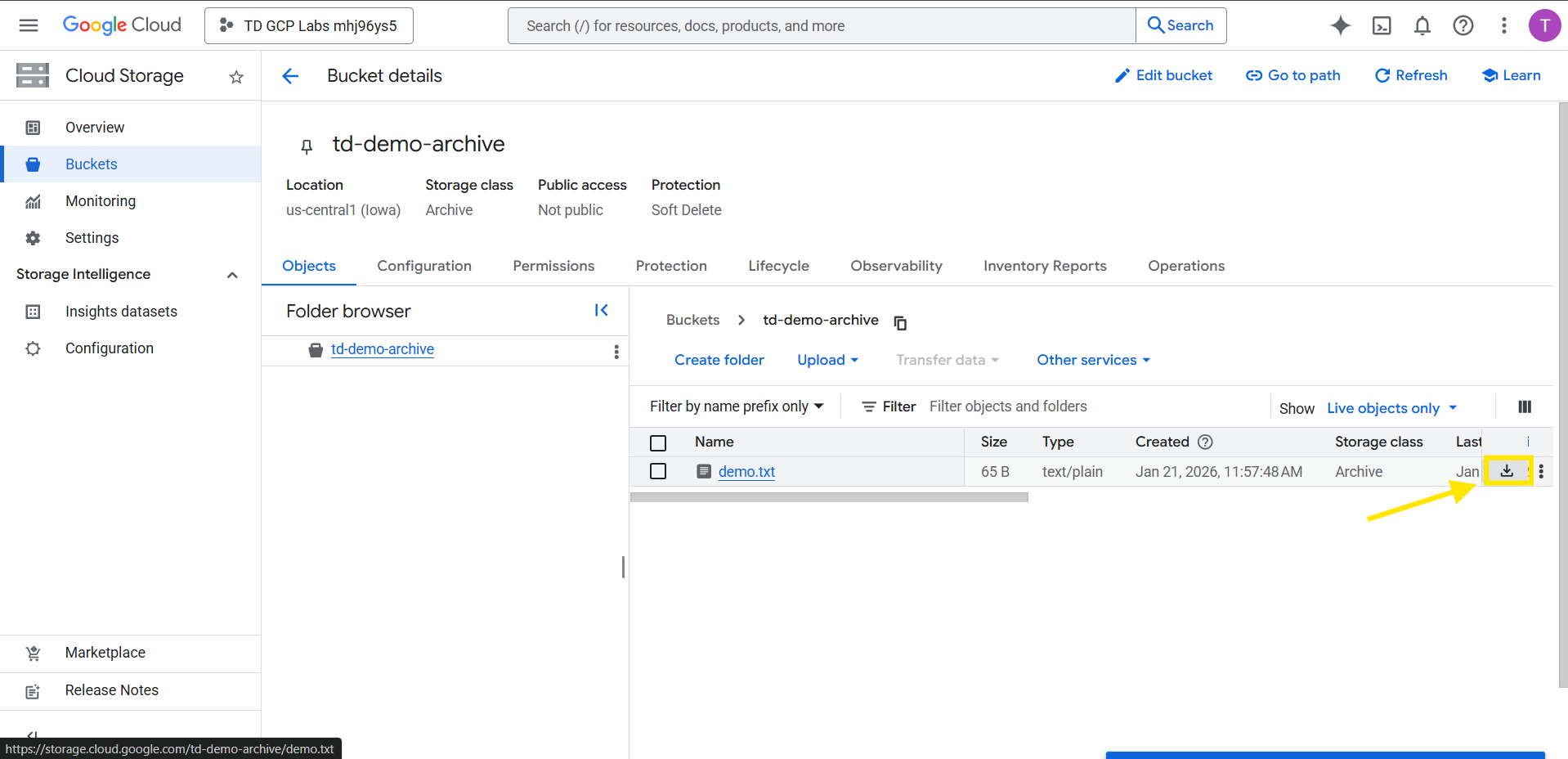 1. Open the Standard bucket, locate your uploaded demo.txt file, and click Download. Observe how quickly the file is retrieved.