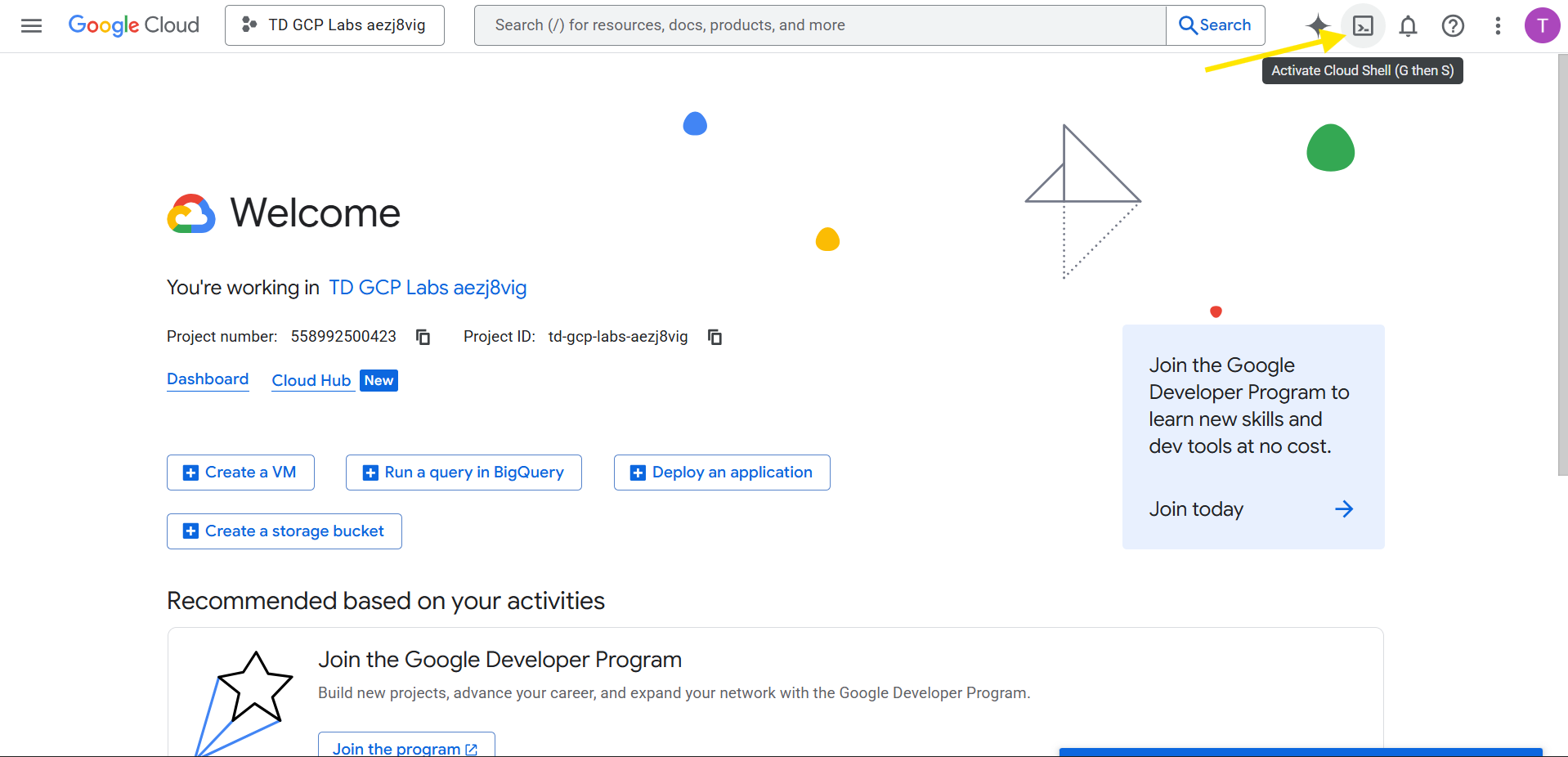 1. Click Activate Cloud Shell in the top-right corner of the console.
