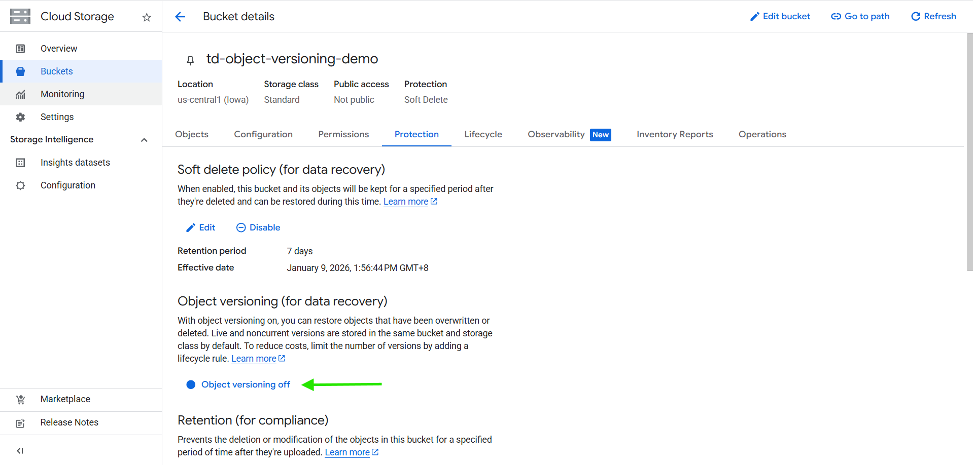 2. In the Protection section, enable Object Versioning.