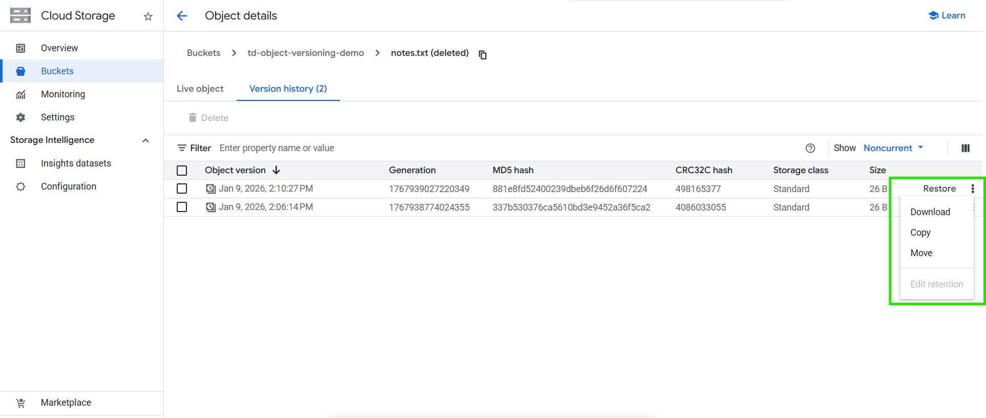 3. Click the notes.txt (Noncurrent)
