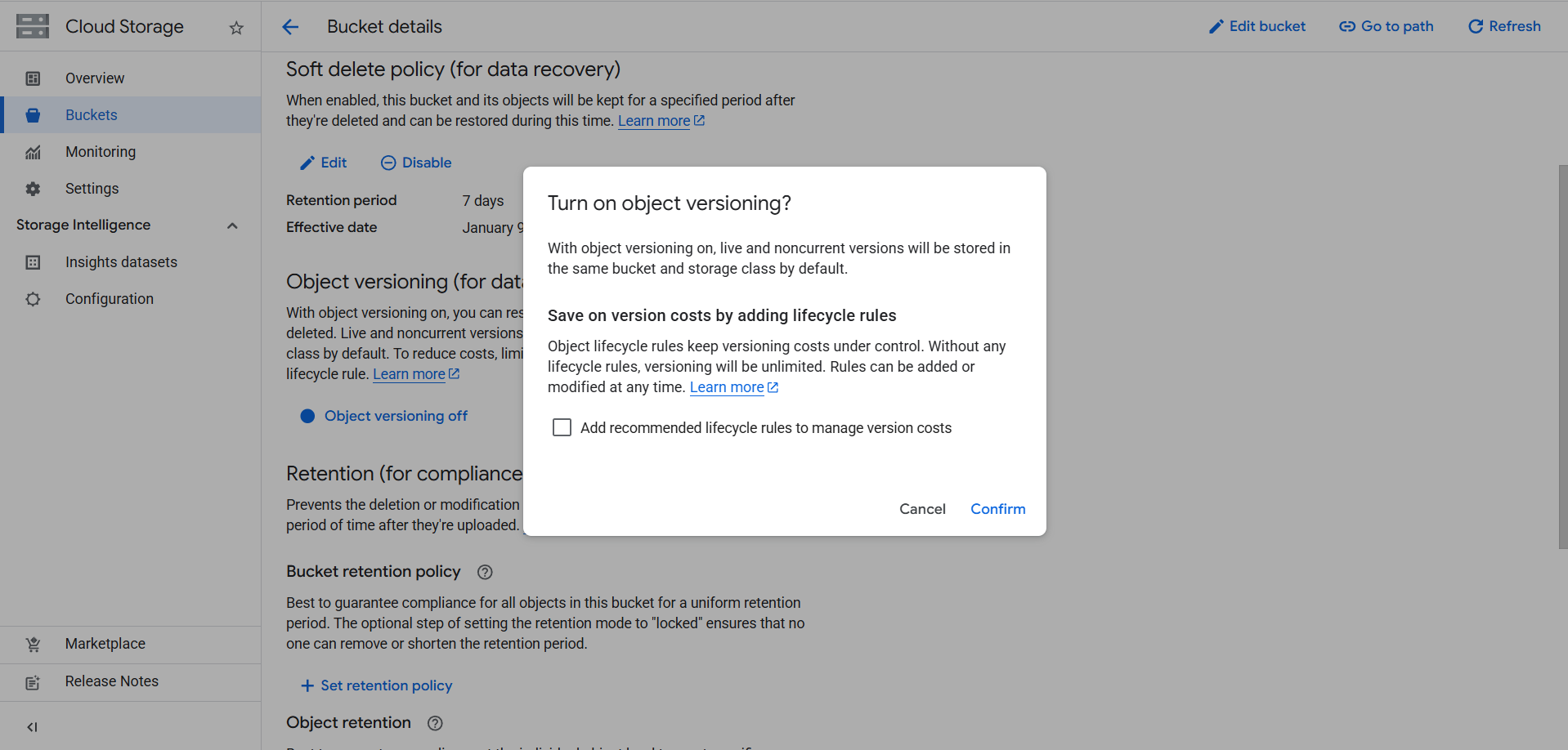 - If you check this box, Google Cloud will automatically add lifecycle rules to control storage costs: