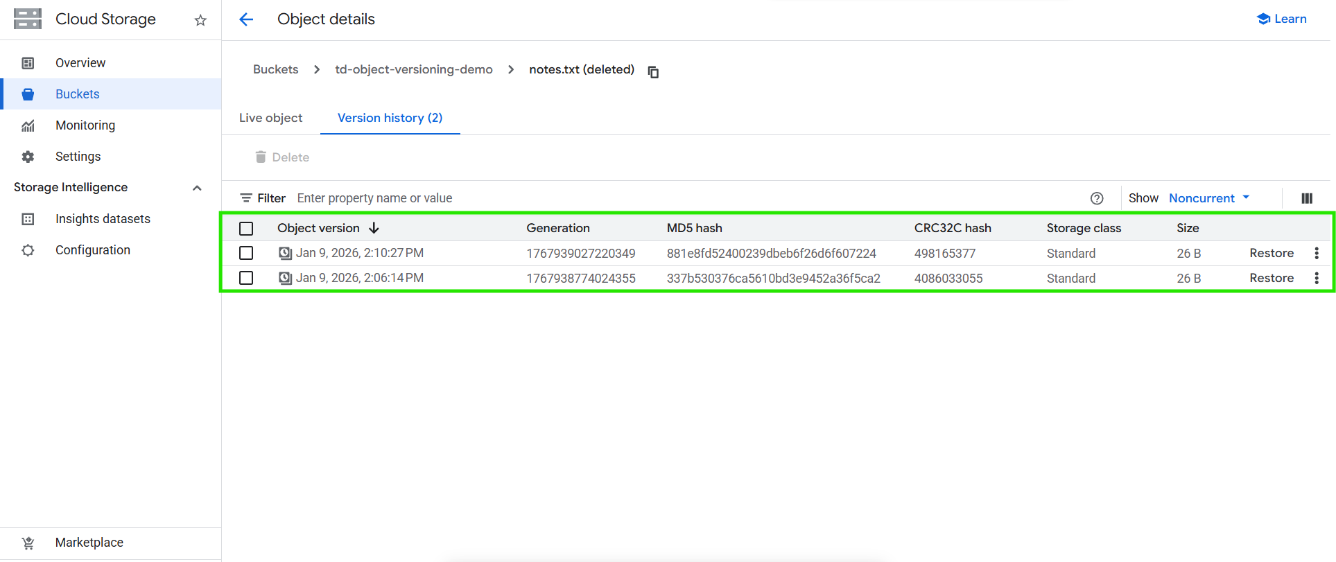 4. Locate the noncurrent version of notes.txt (identified by its generation number).