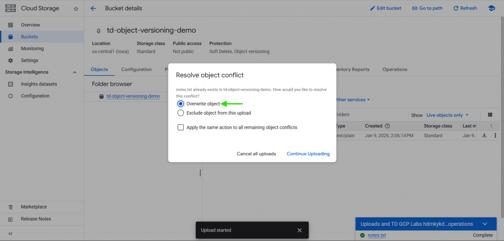 - Cloud Storage will retain both versions.