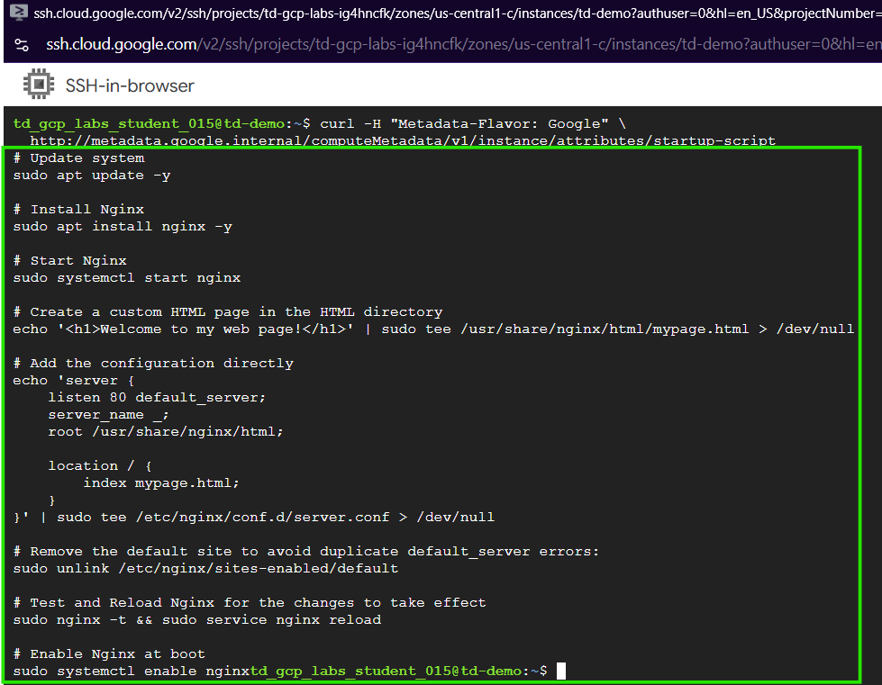 2. Run the following command to retrieve the startup script stored in the VM’s metadata: