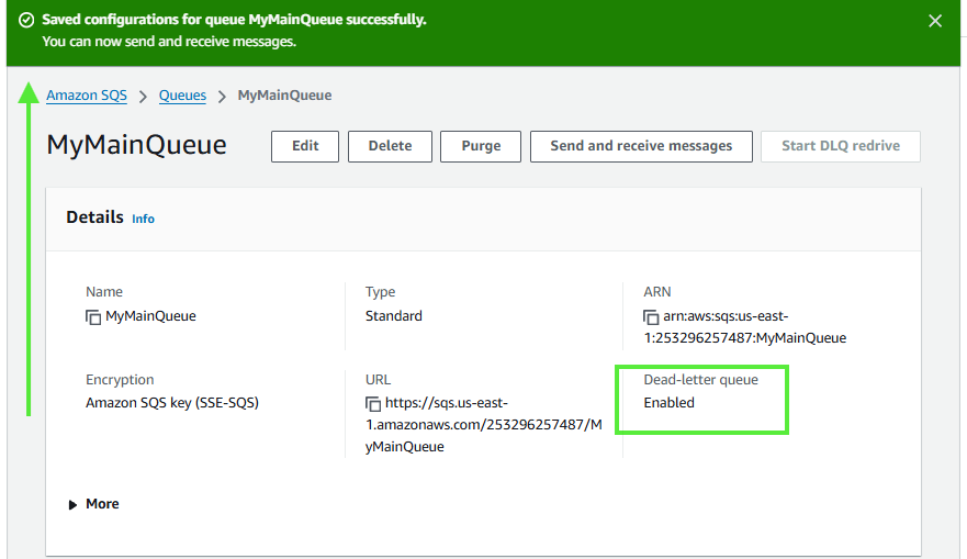 Congratulations! You have successfully configured a Dead Letter Queue (DLQ) in Amazon SQS to capture messages that fail processing in the main queue. This setup helps isolate problematic messages, making it easier to troubleshoot issues without interrupting the main queue.
