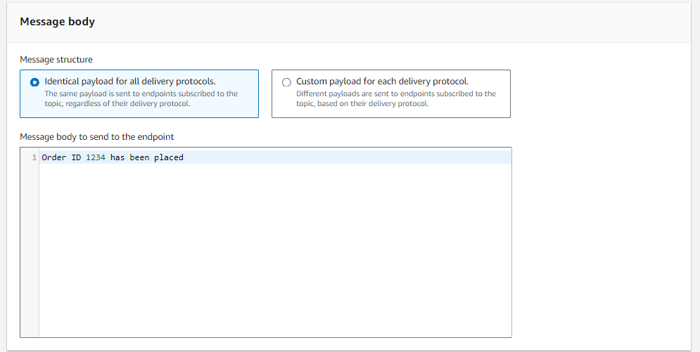 - Provide the Message body (e.g., “Order ID 1234 has been placed”) in the message creation form.