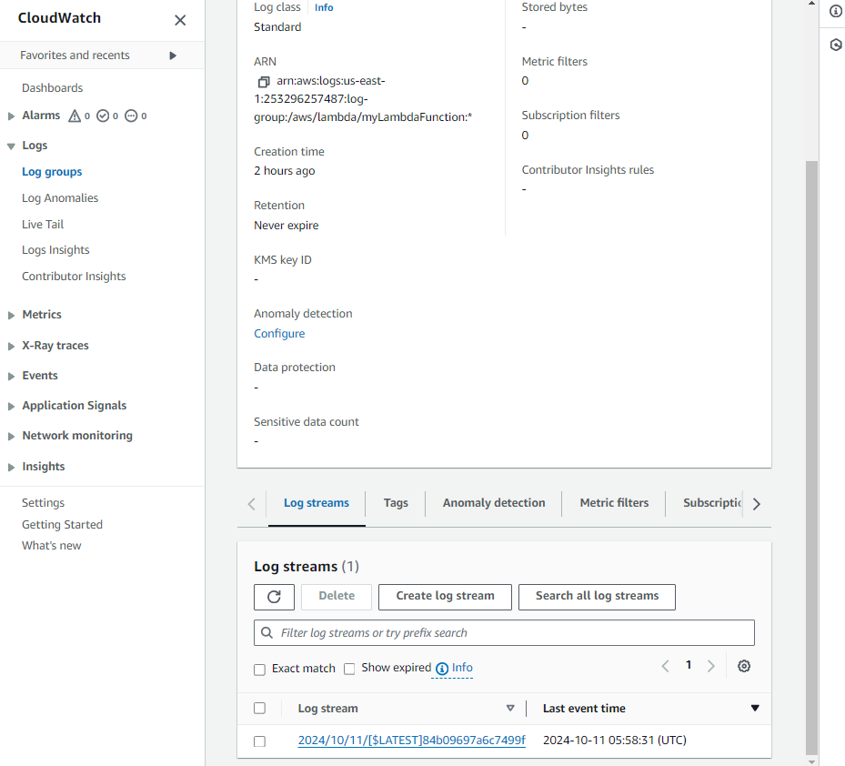 Note: If you can’t see a new log, the logs might be written on a different log stream. Go back to the /aws/lambda/myLambdaFunction page. You should see a new Log stream. Click on it