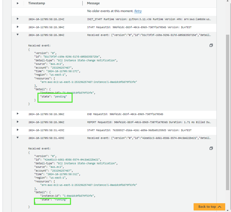 5. You should see logs indicating that the Lambda function was triggered by the EC2 instance entering the pending and running states.