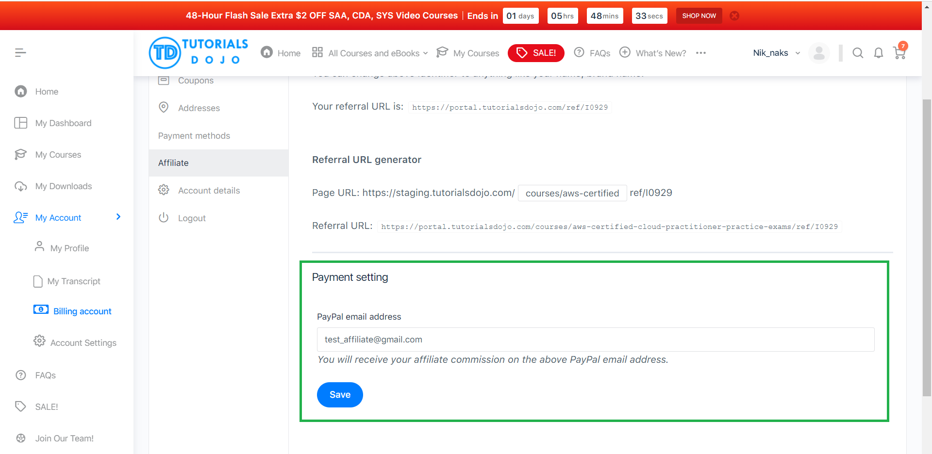 Under the My Account, select Affiliate. After clicking, you will see the Reports and Profile section, then select Profile. Note that there are two ways to promote Tutorials Dojo products via affiliate links. First is your generic referral URL. The generic referral URL comprises the TD Portal Home page, allowing your referrals to play around on the TD Portal Website while using your referral link. This can be found in the first content of your Affiliate Profile section. The second is to generate unique affiliate links for specific products. All you need is to paste the target path of the course into the space provided.